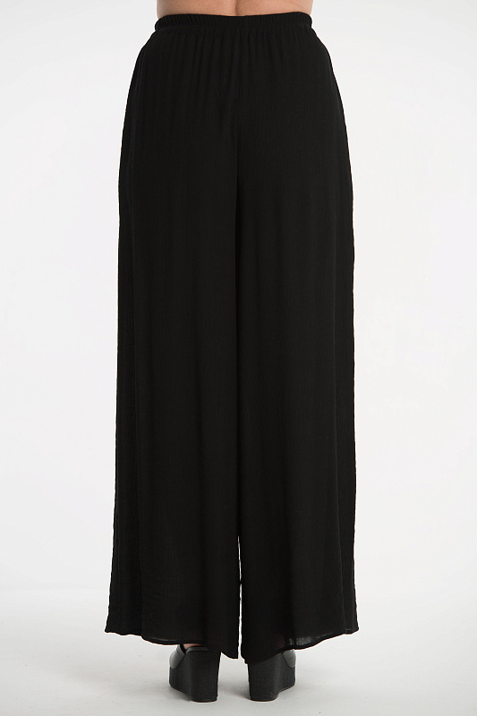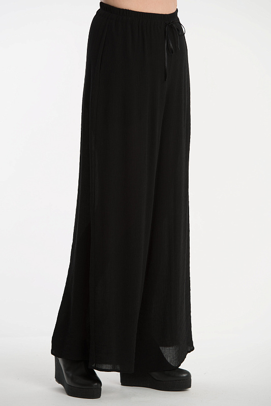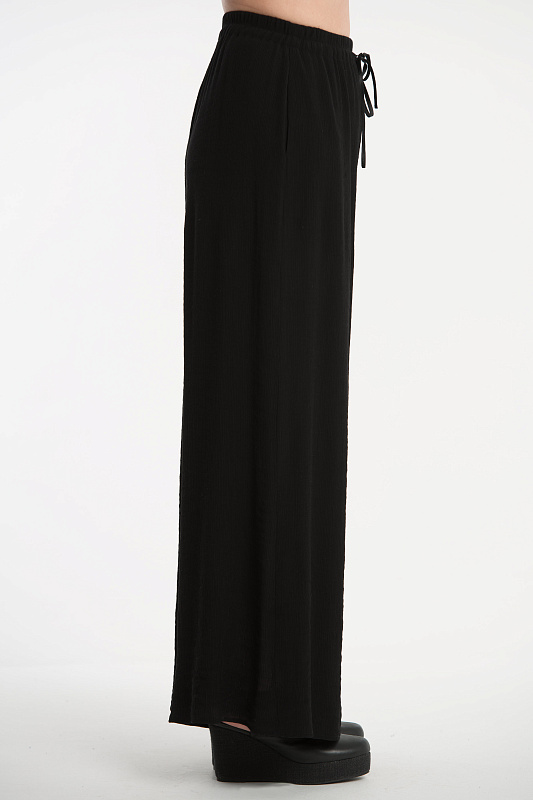 Прямые широкие брюки из вискозной ткани гофре. Пояс со шнуром в кулиске, в боковых швах карманы.