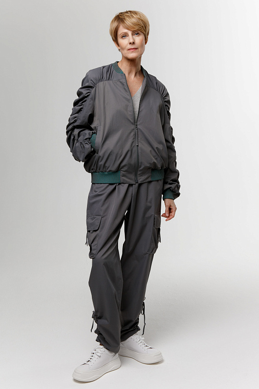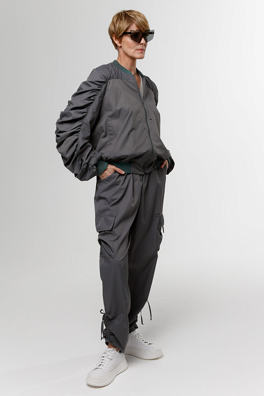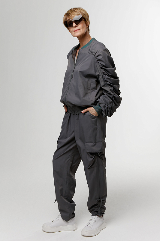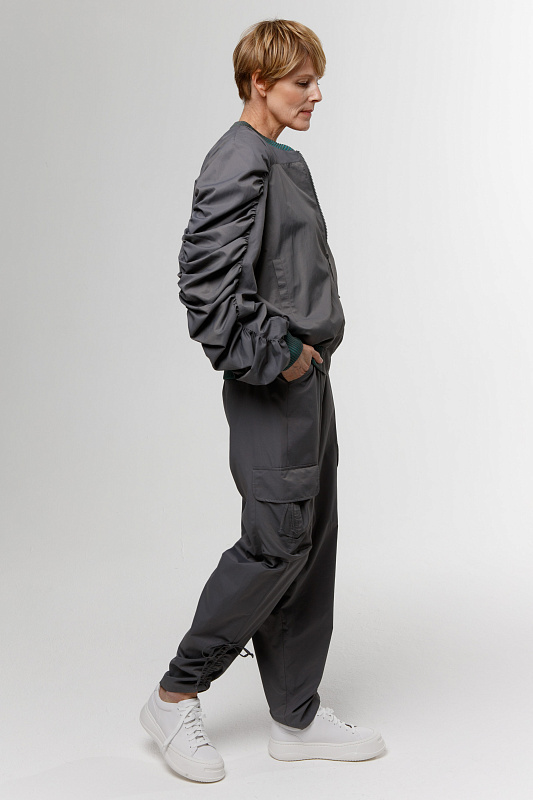 Трендовые креативные брюки карго с оригинальной сборкой на накладных карманах и по низу. Пояс на резинке и шнурке. Два удобных кармана с отрезным бочком.