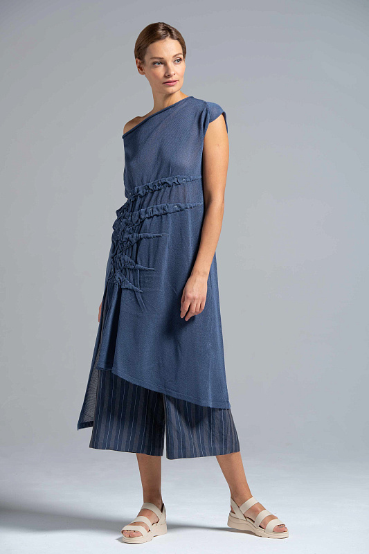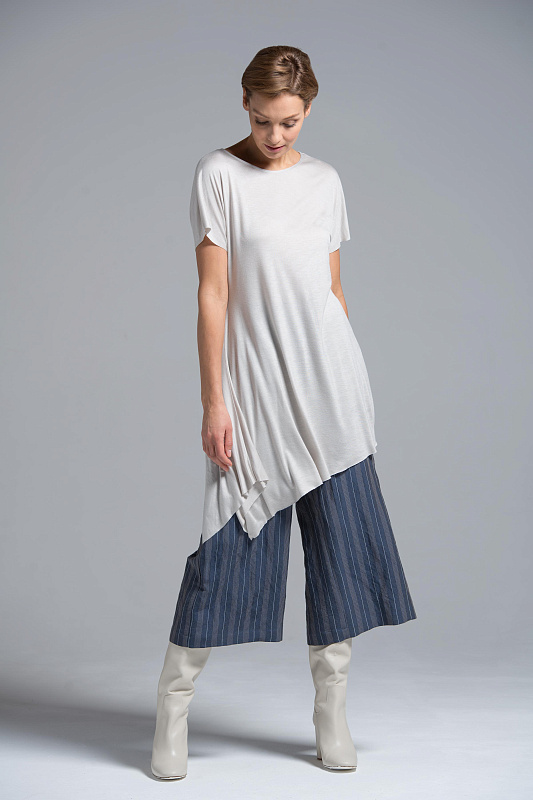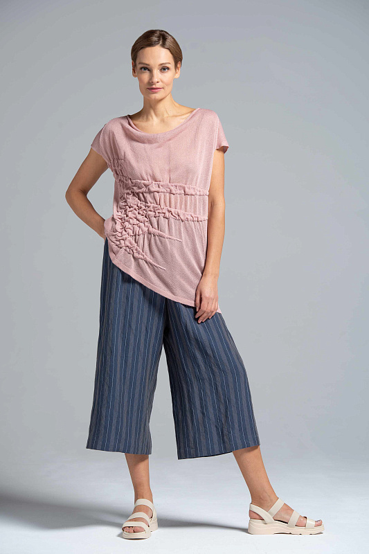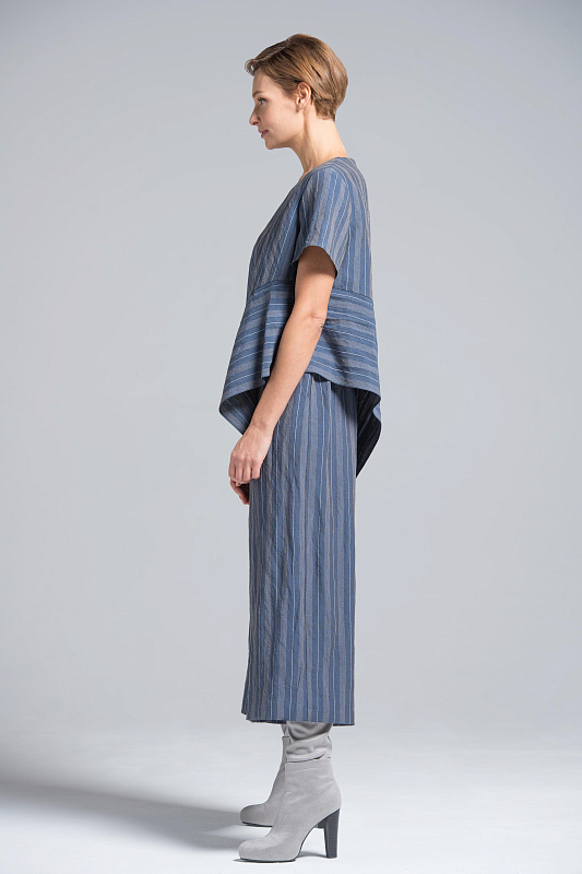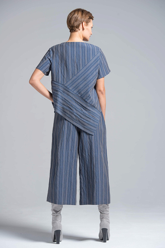 Брюки-кюлоты свободного кроя в полоску. Пояс на резинке и на пуговице, карманы с отрезным бочком. Элегантные кюлоты идеально подойдут как на каждый день, так и для образа на выход. Модель выполнена из экологичного итальянского льна в комбинации с нежной вискозой.