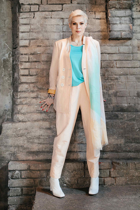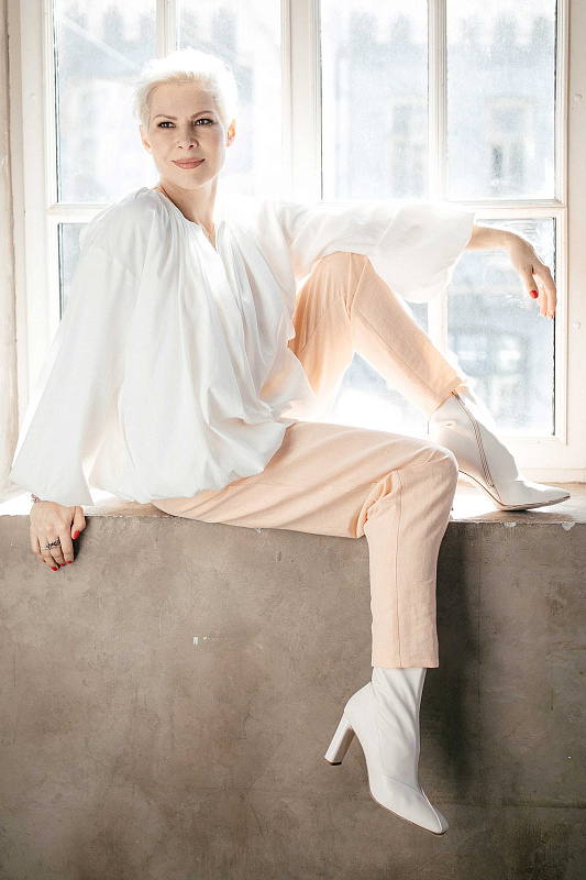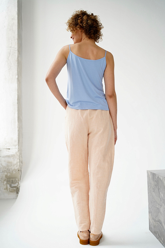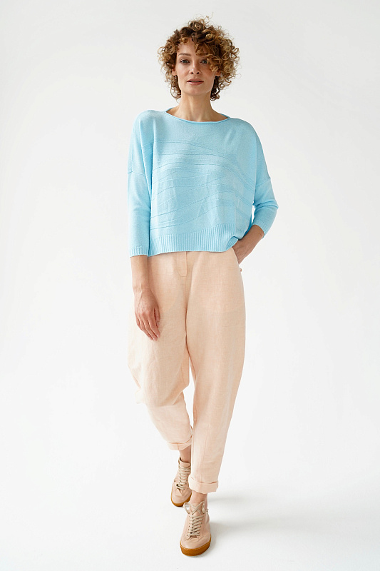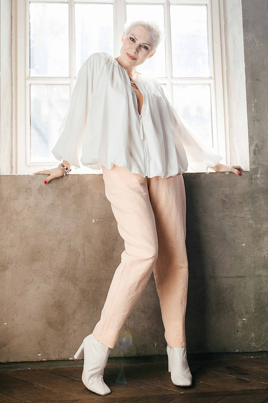 Брюки оригинальной дизайнерской конструкции силуэта «ромб». Удобная высокая посадка, карманы с отрезным бочком, застежка на молнии и пуговице, задняя часть пояса выполнена на резинке.