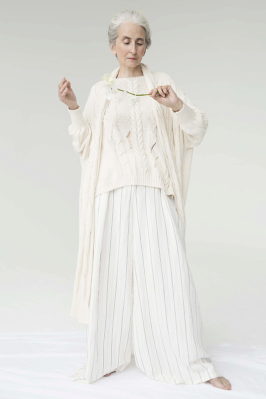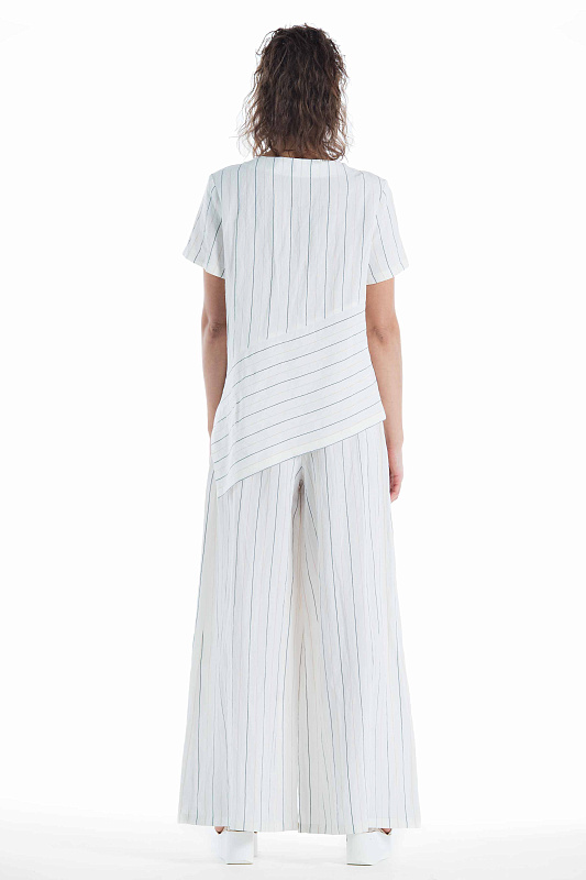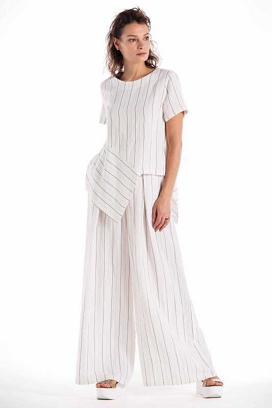 Широкие льняные брюки-палаццо, карманы внутри шва, пояс на резинке и на пуговице, с глубокими ниспадающими складками от линии талии. С помощью брюк-палаццо можно создать абсолютно любой образ от роскошного вечернего и сдержанно-делового до расслабленного бохо-образа, уместного на пляже. Длина изделия по боковому шву 112 см.