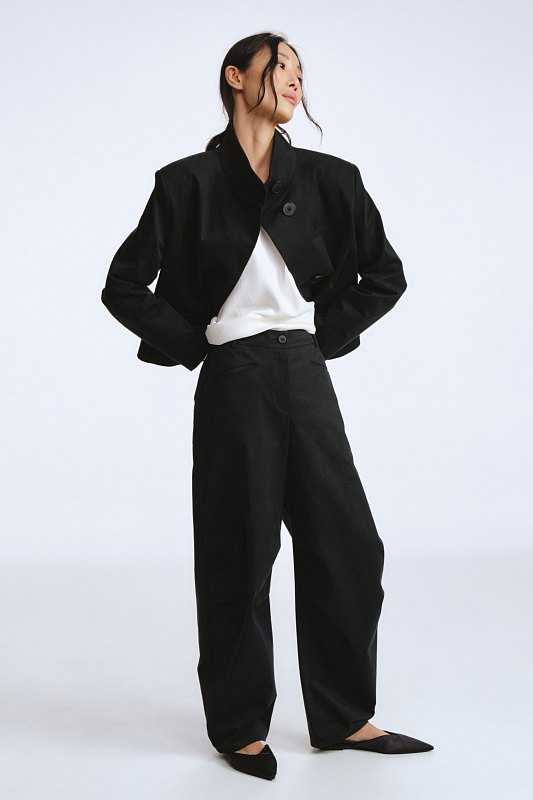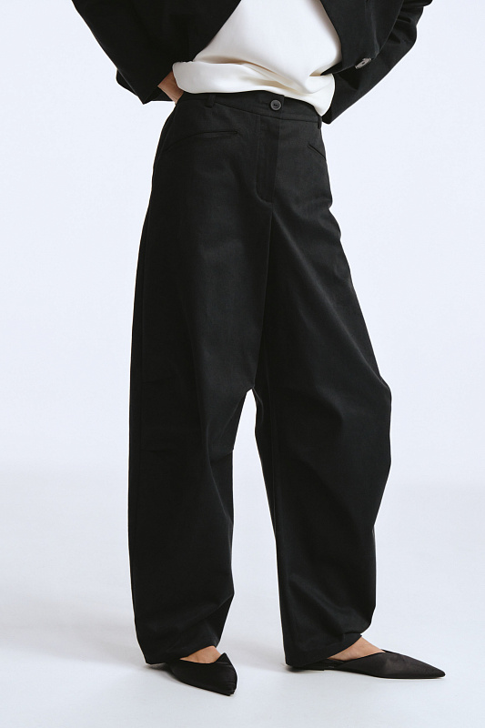 Брюки трендового силуэта «овал», слегка зауженные к низу. Свободный крой не сковывает движений. Защипы во внешнем боковом шве на уровне колена делают силуэт «овал» более выраженным. Кокетка на задней части брюк — это элемент дизайна, который придаёт стильный вид. Пояс на резинке сзади обеспечивает плотную посадку, не сковывая движений. Молния с пуговицей спереди — это классический вариант застёжки, который придаёт брюкам элегантный вид. Такое сочетание делает модель практичной и стильной одновременно. Карманы добавят функциональности, а их горизонтальное расположение — интересный дизайнерский акцент. Брюки станут идеальной парой к жакету арт 2725200.