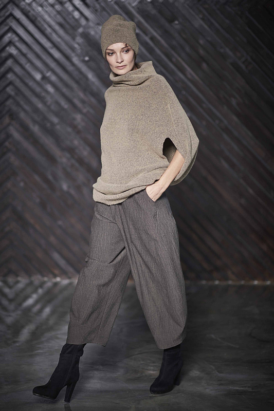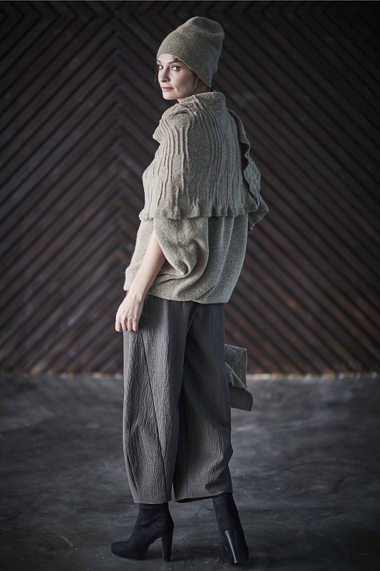 Брюки широкие, оригинальной овальной конструкции, со смещенными боковыми швами, укороченные. Застежка - на молнию и пуговицы, пояс на резинке, карманы с отрезным бочком.