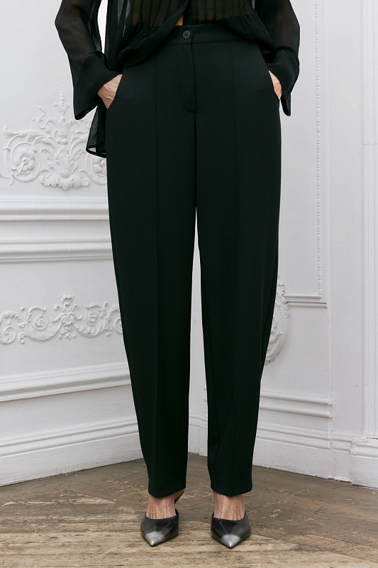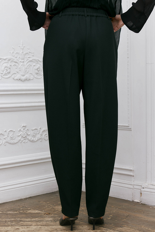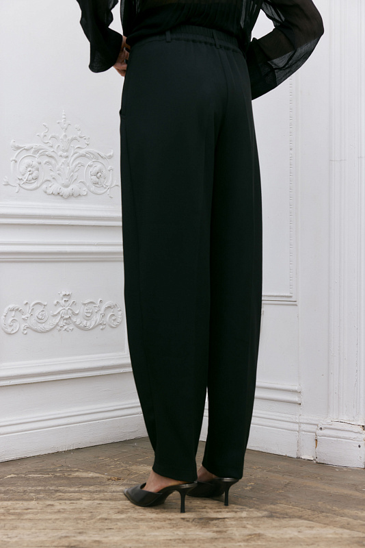 Брюки трендового силуэта овал слегка зауженные к низу, имеют свободный, не облегающий крой. Они подходят для создания расслабленного и комфортного образа. Пояс на резинке сзади обеспечивает плотную посадку, не сковывая движений. Молния с пуговицей спереди - это классический вариант застёжки, который придаёт брюкам элегантный вид. Небольшой, но значимый элемент - застроченная стрелка спереди, свидетельствует о внимании дизайнера к деталям и подчёркивает безупречный стиль. Фигурные карманы добавляют интересный акцент. Это оригинальный элемент дизайна, который придаёт модели уникальность. Уникальная фактурная ткань — результат гармоничного союза вискозы и нейлона. С жакетом арт. 2625000 брюки составляют идеальную пару.