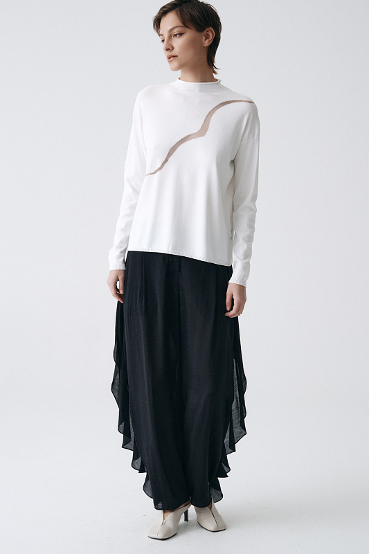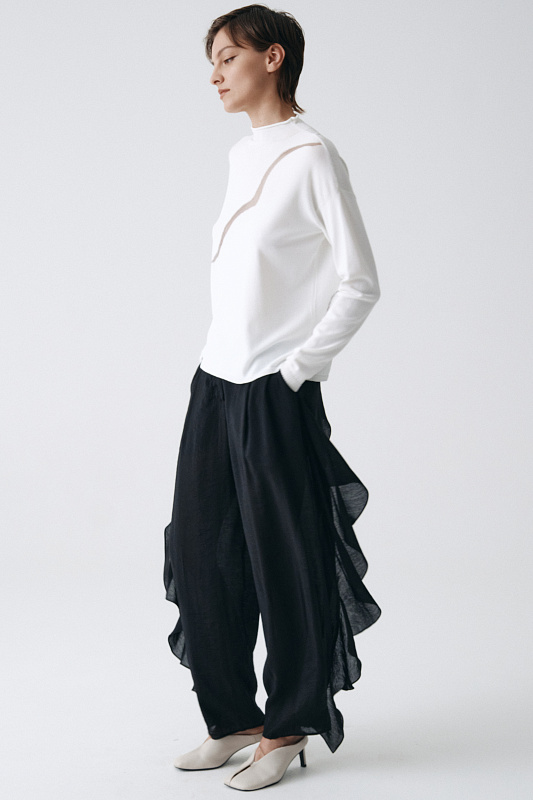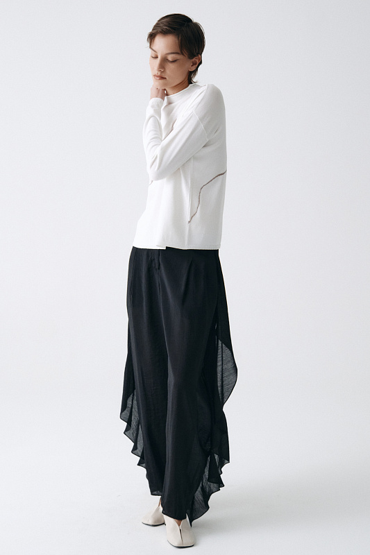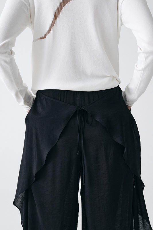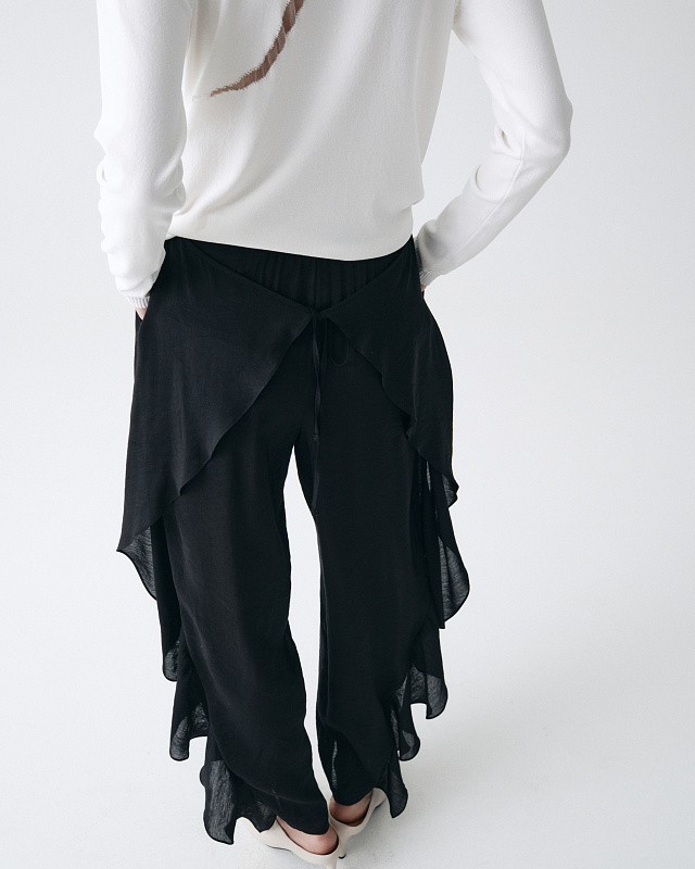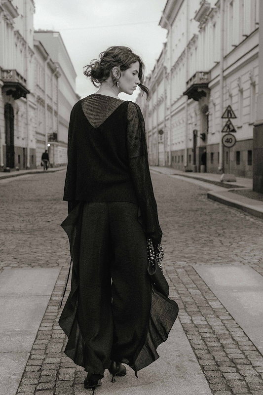 Брюки-иллюзия. Модель соткана из воздуха и элегантности. Их прозрачность — это не отсутствие тайны, а ее игра. Прямой крой обеспечивает универсальность и комфорт, а асимметрия деталей добавляет характера: строгая молния и пуговица спереди контрастируют с мягкой резинкой сзади. Скрытые карманы — это гениальное сочетание практичности и безупречного дизайна. В швы бережно вписана особая деталь, проходя по всей длине, она образует изящные воланы и создает гипнотический эффект парящего силуэта. Последний штрих в виде завязок на воланах добавляют вариативность модели. Их можно завязать, можно оставить свободно ниспадать для расслабленного образа, меняя настроение.