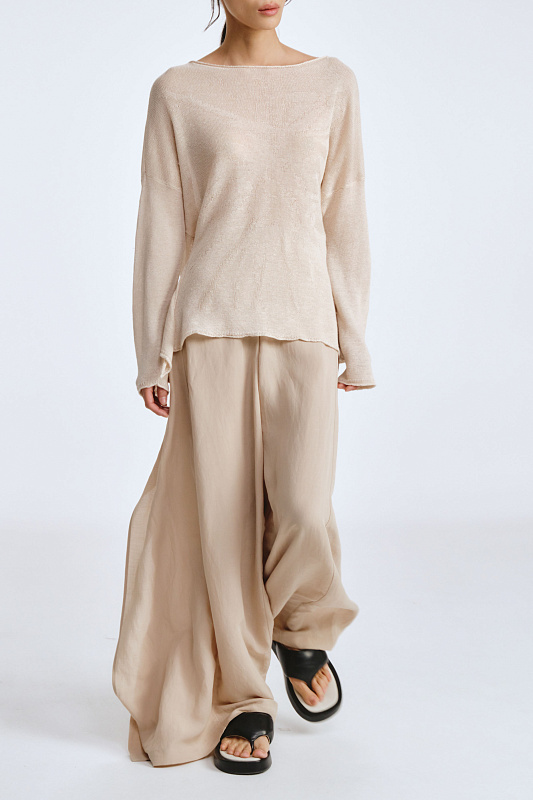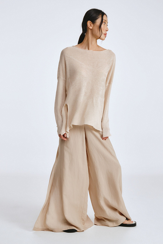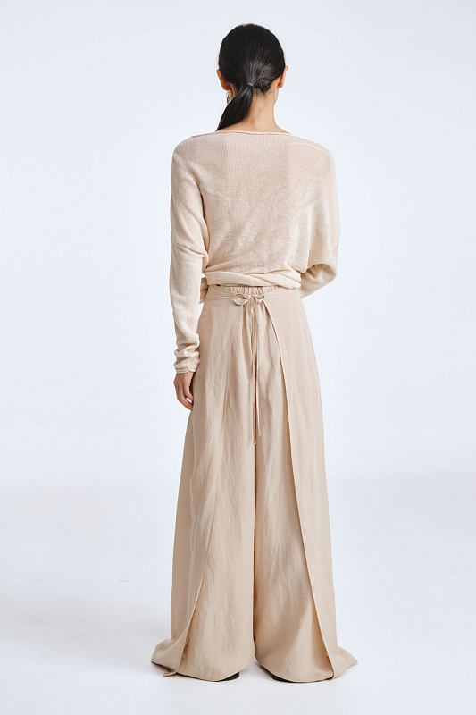 Эти широкие брюки отличаются прямым и свободным кроем с высокой посадкой. Сзади они фиксируются поясом на резинке, что обеспечивает плотную посадку, не стесняя движений. Классический вариант застежки — молния с пуговицей — придаёт брюкам элегантный вид. Необычный дизайнерский приём — дополнительная строчка спереди, которая заменяет боковой шов и, словно тонкая нить, вытягивает силуэт. Карманы, скрытые в этой дополнительной строчке, добавляют модели функциональности. Эксклюзивность модели придаёт усложнённый крой. Декоративные элементы в виде отлетных деталей, вшитые в дополнительную строчку, создают верхний слой и пикантно закрывают высокий боковой разрез. При ходьбе создаётся ощущение полета и загадочности. Сзади отлетные детали игриво фиксируются тонкой декоративной завязкой. Эти мелкие детали гармонично вписаны дизайнерами в крой, создавая уникальную модель.