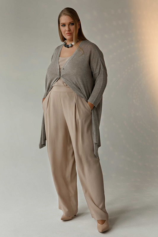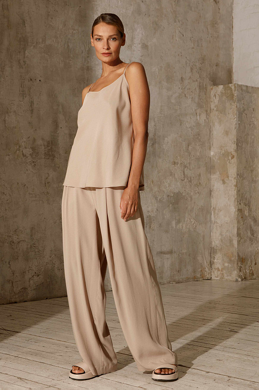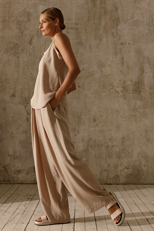 Креповые брюки с идеальной посадкой по фигуре прямого силуэта. Пояс на резинке. Прорезные карманы с листочкой. Ткань с атласной внутренней стороной. Прекрасная основа для создания как эффектных вечерних, так и образов на каждый день.