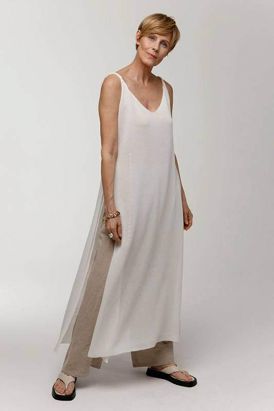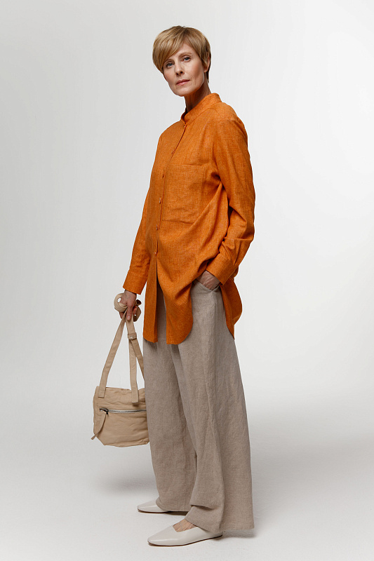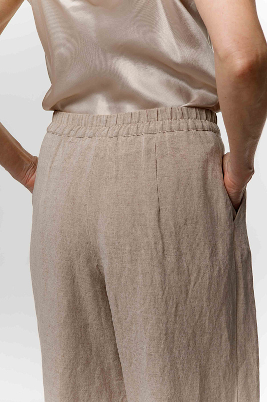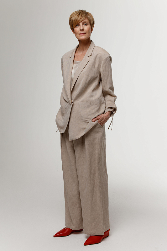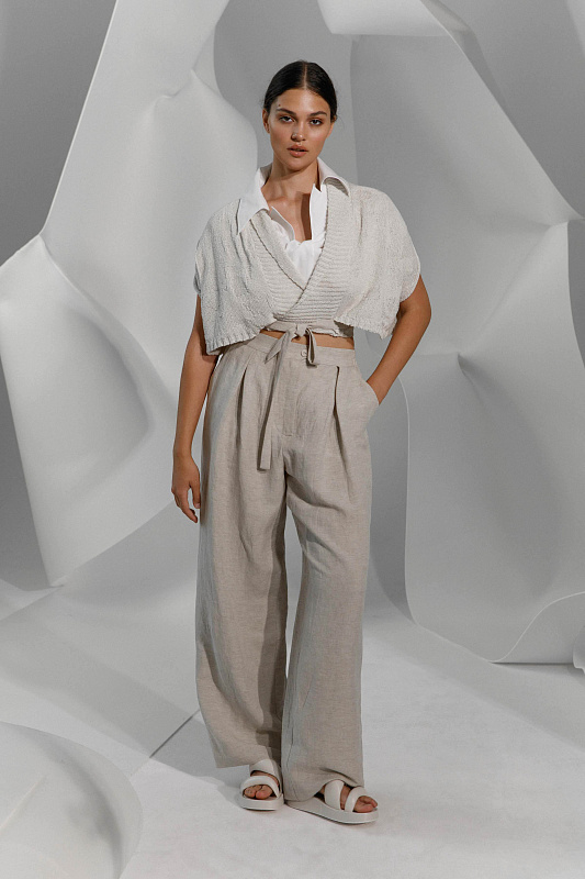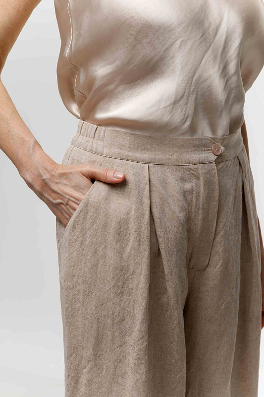 Вальяжные брюки со складками расслабленного силуэта. Пояс сзади на резинке. Застежка - молния. Карманы с отрезным бочком. Особую оригинальность модели придает фактурная вискозная ткань с добавлением льна.