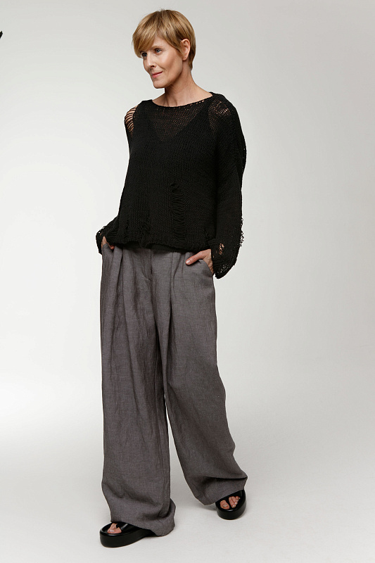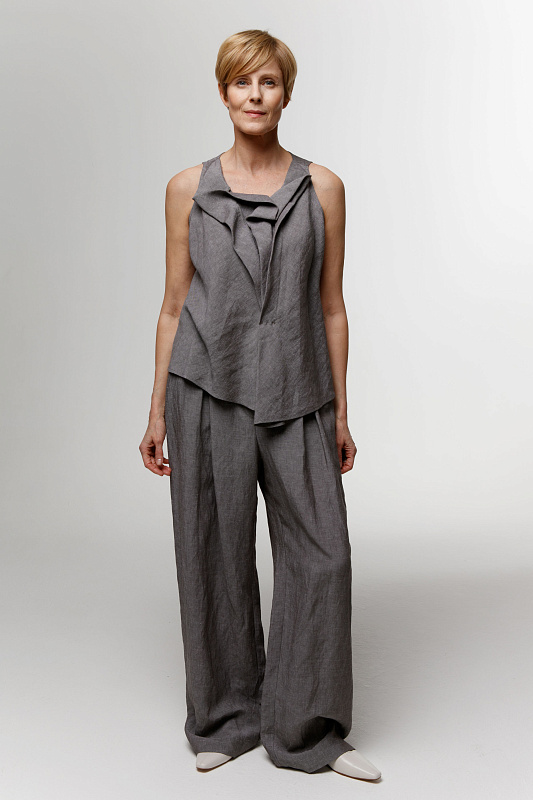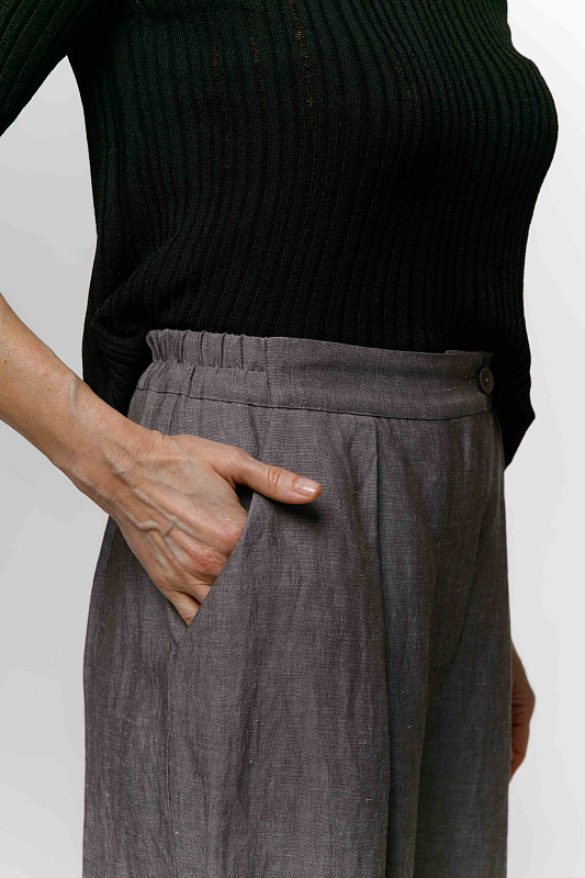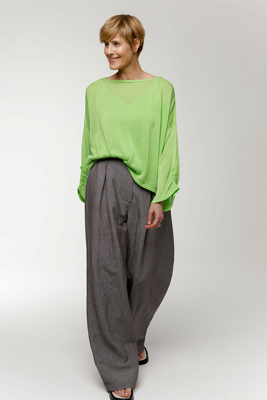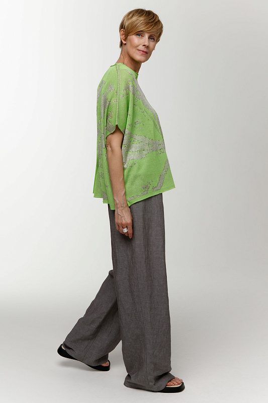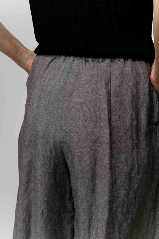 Вальяжные брюки со складками расслабленного силуэта. Пояс сзади на резинке. Застежка - молния. Карманы с отрезным бочком. Особую оригинальность модели придает фактурная вискозная ткань с добавлением льна.
