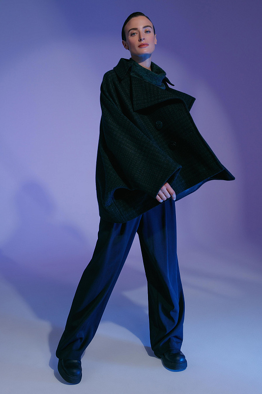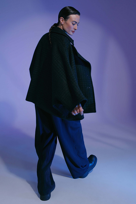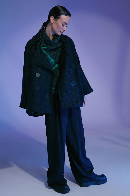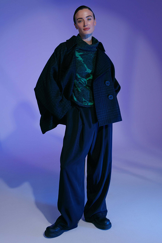 Вальяжные брюки  со складками расслабленного силуэта из плотной эластичной вискозы. Пояс сзади на резинке. Застежка - молния. Карманы с отрезным бочком.
