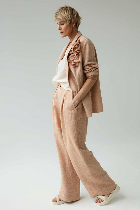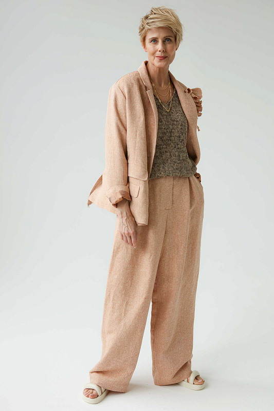 Вальяжные брюки со складками расслабленного силуэта. Пояс сзади на резинке. Застежка - молния. Карманы с отрезным бочком. Особую оригинальность модели придает фактурная ткань елочка, в составе которой лен и шелк.