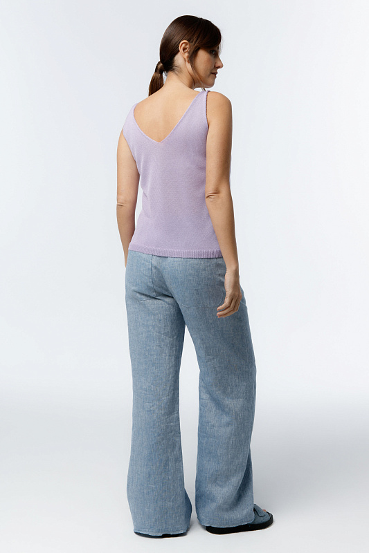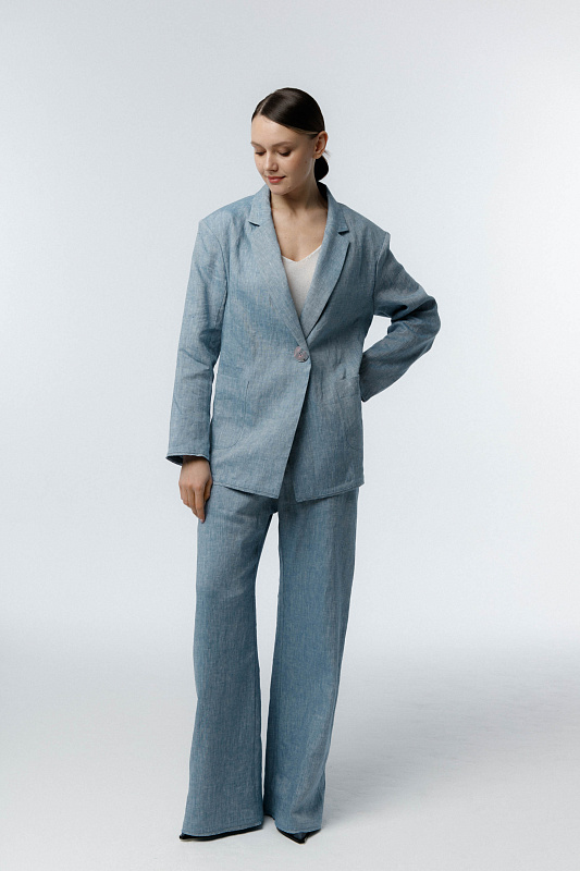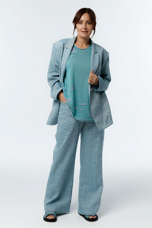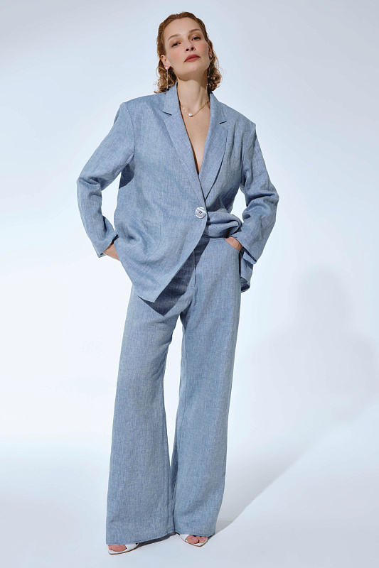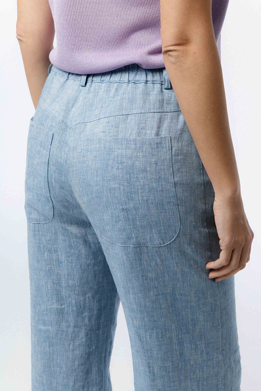 Прямые льняные широкие брюки расслабленного силуэта. Пояс сзади на резинке. Застежка на молнию с пуговицей. Оригинальность модели добавляют необработанные края внизу брючин. Карманы с отрезным бочком и вместительные накладные карманы сзади. Рекомендуем носить в комплекте с жакетом из одноименной капсулы, формируя стильную костюмную пару.