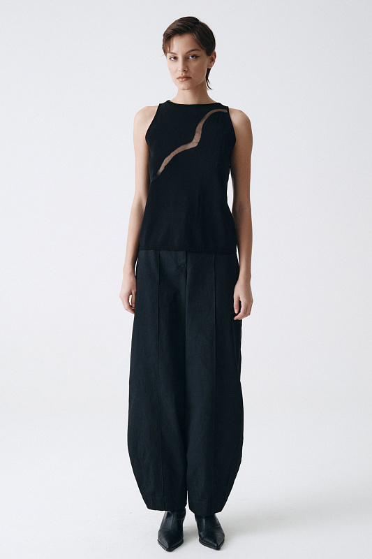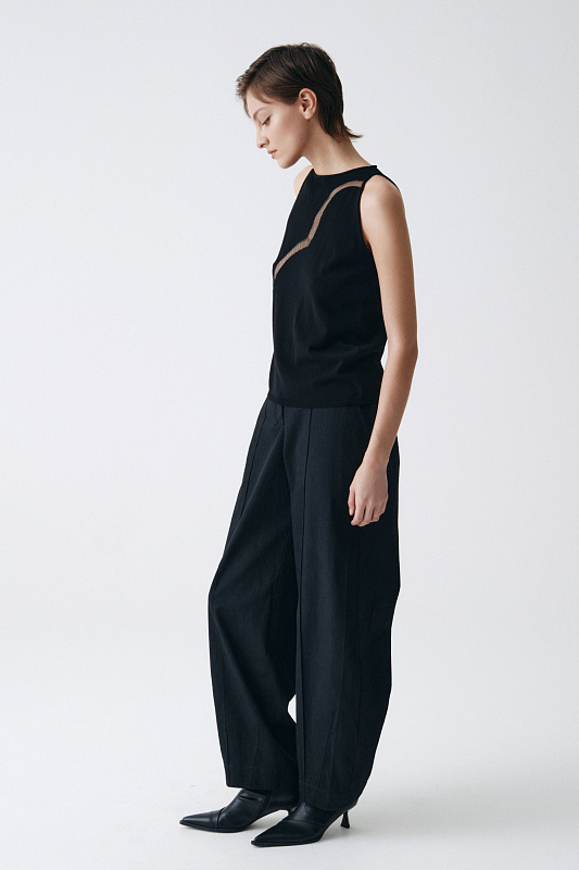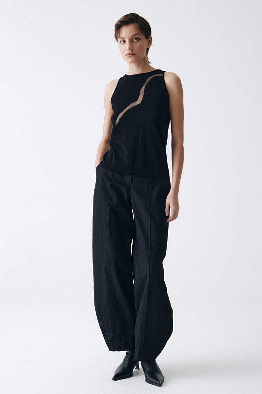 Представьте брюки, которые работают на вас 24/7. Их работа — делать вас безупречной. Не вытягиваются на коленях, держат форму, как будто только что из ателье. Застроченная стрелка задает вектор к безупречности. Внизу силуэт заужен, но не просто, а пластичным кроем — застрочками, вытачками. Для безукоризненного вида спереди пояс на молнии и пуговице, а сзади для ощущения свободы и легкости — резинка. Шлевки на поясе, чтобы вы могли добавить акцент в образ — ремень, например. Карманы? Обязательно! Они есть спереди. Эти брюки для идеального дня, от утреннего кофе до вечерних прогулок.