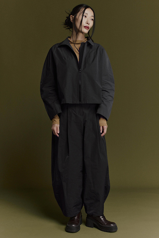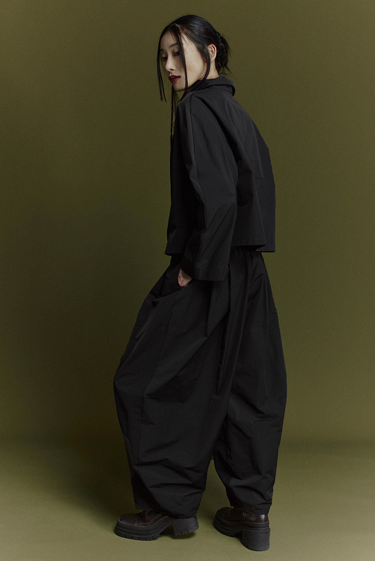 Модель свободного, не облегающего кроя, выполнена из плотного хлопка с добавлением полиэстера. Глубоко заложенные складки делают силуэт «ромб» более выраженным, а низ брюк — зауженным. Удобные карманы с отрезным бочком — немаловажная деталь кроя. Резинка сзади регулирует объем, а застежка-молния и пуговица спереди обеспечивает плотную посадку. Брюки универсальные, оригинального дизайна. Для создания комфортного городского образа мы рекомендуем комплектовать модель с жакетом артикул 2126000
