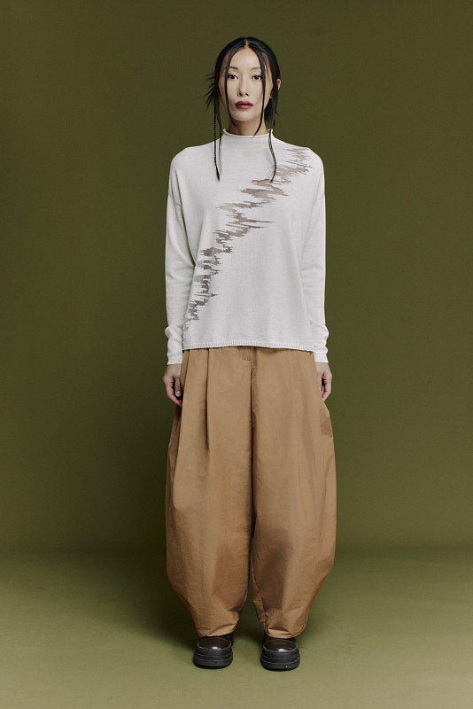 Модель свободного, не облегающего кроя, выполнена из плотного хлопка с добавлением полиэстера. Глубоко заложенные складки делают силуэт «ромб» более выраженным, а низ брюк — зауженным. Удобные карманы с отрезным бочком — немаловажная деталь кроя. Резинка сзади регулирует объем, а застежка-молния и пуговица спереди обеспечивает плотную посадку. Брюки универсальные, оригинального дизайна для создания комфортного, городского образа.