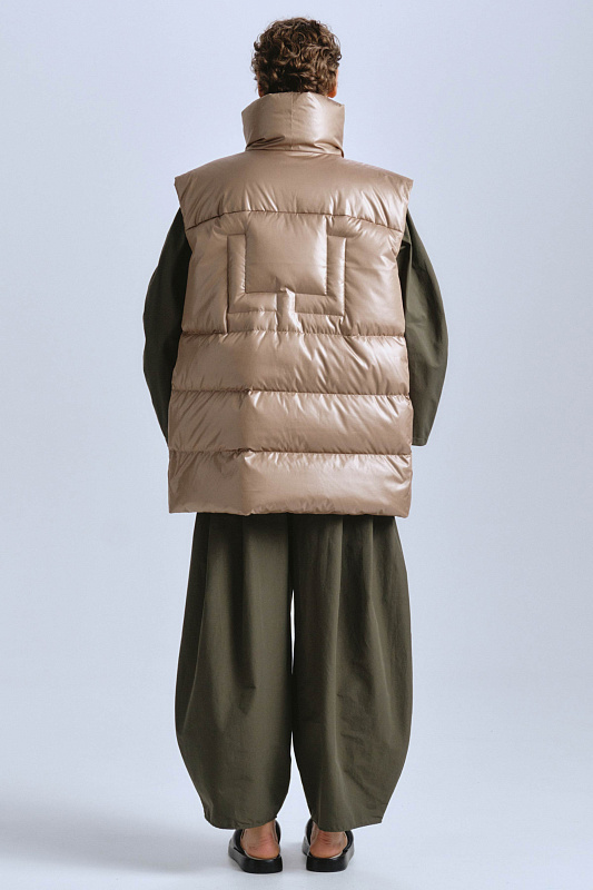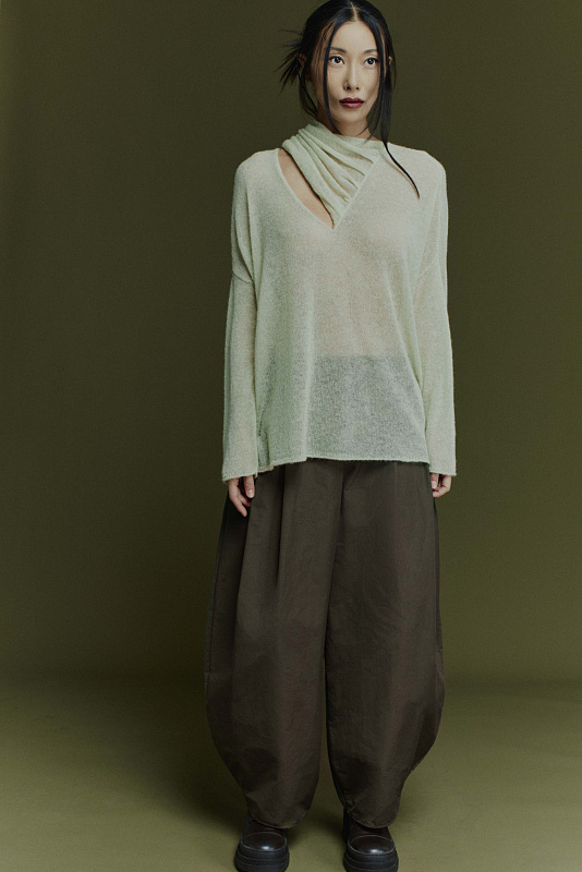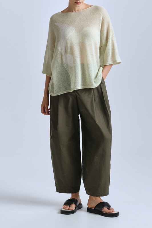 Модель свободного, не облегающего кроя, выполнена из плотного хлопка с добавлением полиэстера. Глубоко заложенные складки делают силуэт «ромб» более выраженным, а низ брюк — зауженным. Удобные карманы с отрезным бочком — немаловажная деталь кроя. Резинка сзади регулирует объем, а застежка-молния и пуговица спереди обеспечивает плотную посадку. Брюки универсальные, оригинального дизайна. Для создания комфортного городского образа мы рекомендуем комплектовать модель с жакетом артикул 2126079.