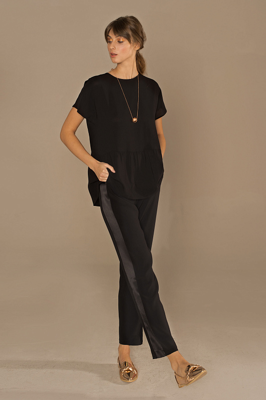 Узкие, но не облегающие брюки, с атласными лампасами. Пояс на резинке с кулисой и завязывающимся атласным шнурком.