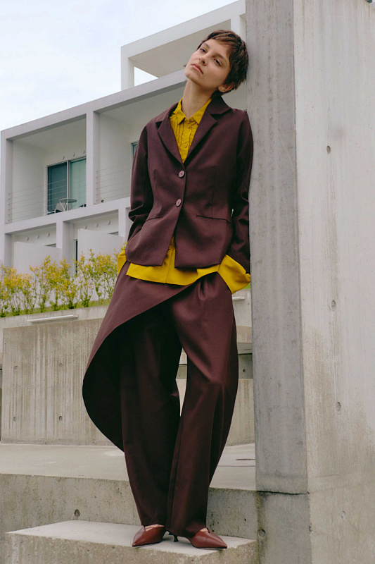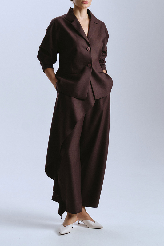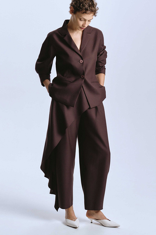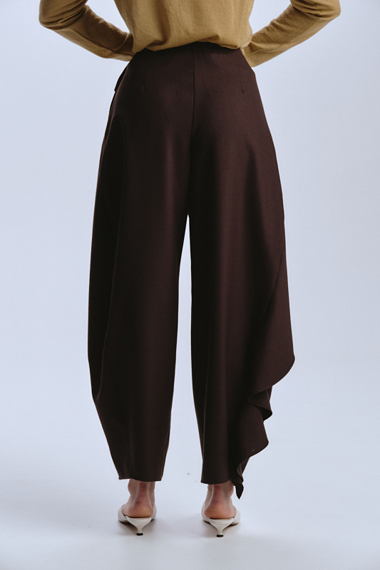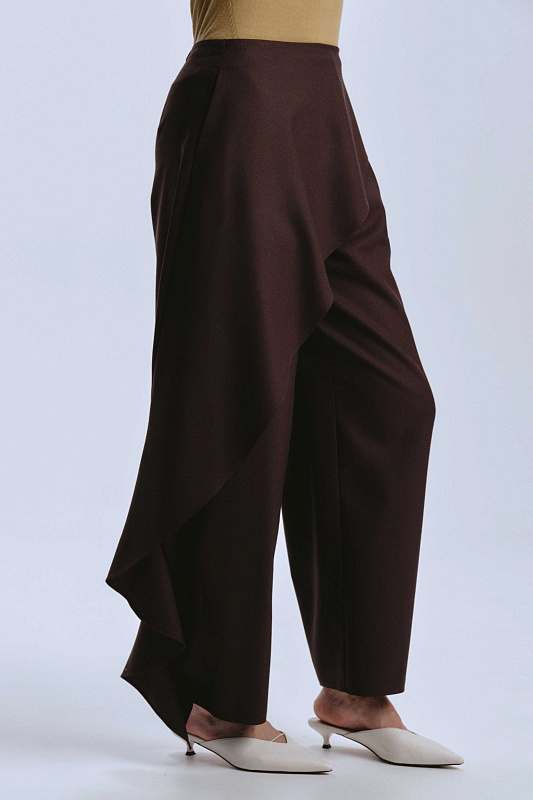 Эффектные брюки из 100% шерсти-креп уникальны своим кроем. Мощным акцентом по переду брюк проходит и продолжается сзади волан. Он придает динамику волны, огибающей ногу. На талии волан фиксируется пуговицей. Сзади часть пояса на резинке. Молния и пуговица, для удобства надевания, спереди скрыта под воланом. Креп — мастер четких линий. Волан будет выглядеть графичным, почти скульптурным. В боковых швах удобные карманы. Используя даже базовый верх, в брюках с волнообразной драпировкой в вашем образе узнаваем почерк дизайнера.