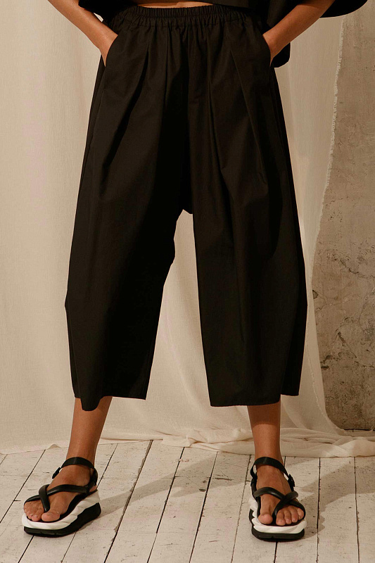 Концептуальные хлопковые брюки оригинальной дизайнерской конструкции. Пояс на резинке. Два удобных кармана.