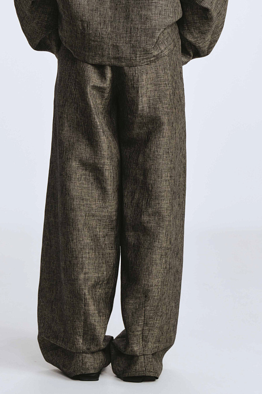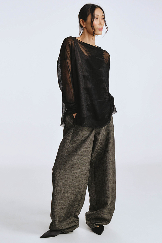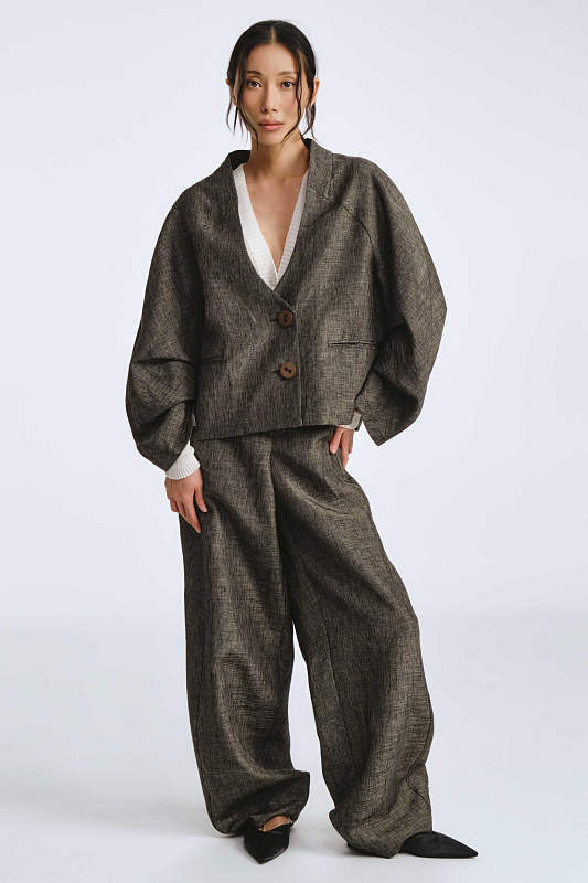 Брюки-бананы, характеризующиеся свободным кроем в области бёдер и зауженным силуэтом книзу, создают соблазнительный изгиб, подчёркивающий изящество фигуры. Особого внимания заслуживает задняя кокетка, она является ключевым элементом дизайна, позволяет избежать «мешковатости» и добавляет стиль. Функциональные карманы, пояс на резинке сзади и молния с пуговицей спереди обеспечивают удобство и комфорт при ношении. Горизонтальный защип снизу на задней стороне брючины — акцент дизайна, делает брюки необычными, удобными в носке. Брюки идеально сочетаются с жакетом арт. 2825279, создавая стильный и гармоничный ансамбль. Выбирайте модели, которые подчеркивают ваши достоинства и отражают характер.