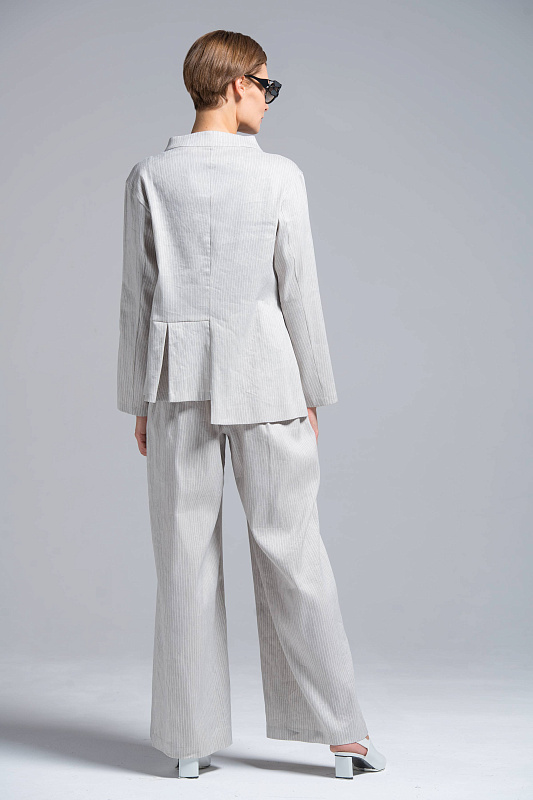 Широкие льняные брюки-палаццо, карманы с отрезным бочком, пояс на резинке и на пуговице. С помощью брюк-палаццо можно создать абсолютно любой образ от сдержанно-делового до роскошного вечернего и расслабленного бохо. Модель выполнена из прекрасного итальянского льна с небольшим добавлением эластана. Полоска визуально вытягивает силуэт и придает модели шарм и динамику.