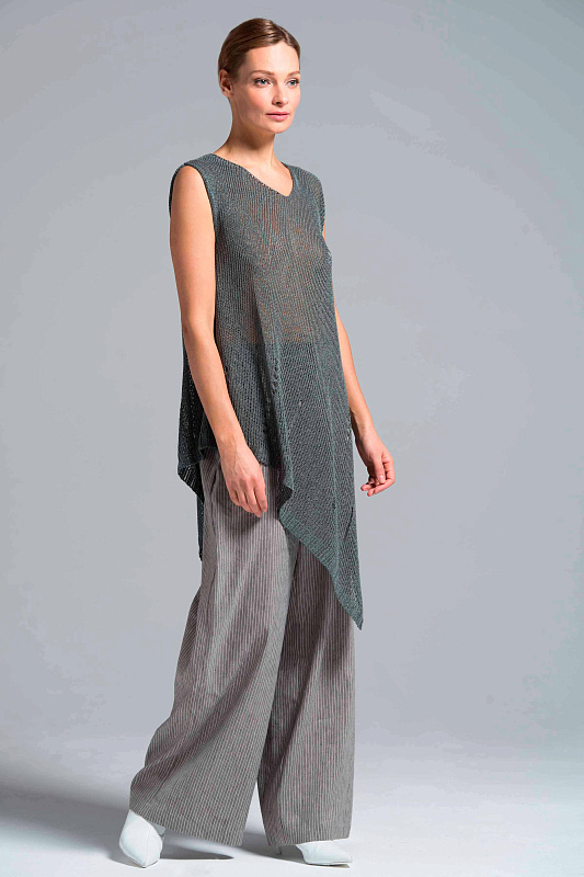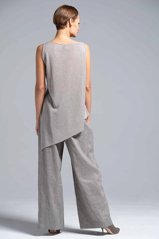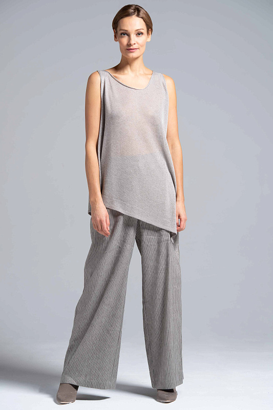 Широкие льняные брюки-палаццо, карманы с отрезным бочком, пояс на резинке и на пуговице. С помощью брюк-палаццо можно создать абсолютно любой образ от сдержанно-делового до роскошного вечернего и расслабленного бохо. Модель выполнена из прекрасного итальянского льна с небольшим добавлением эластана. Полоска визуально вытягивает силуэт и придает модели шарм и динамику.