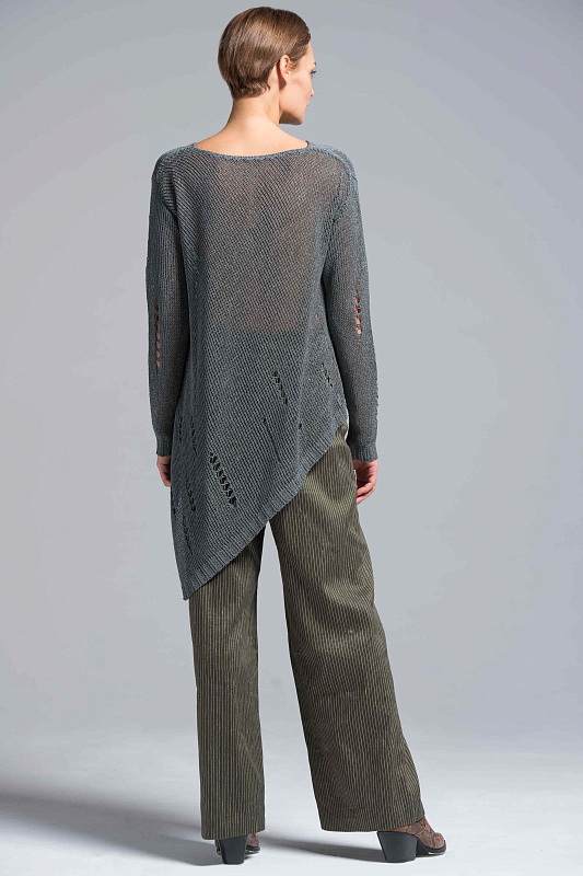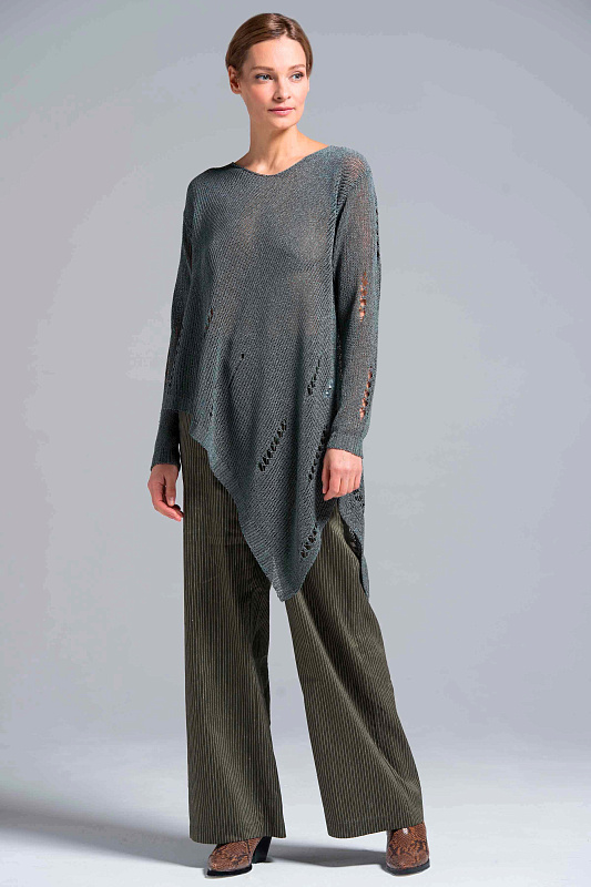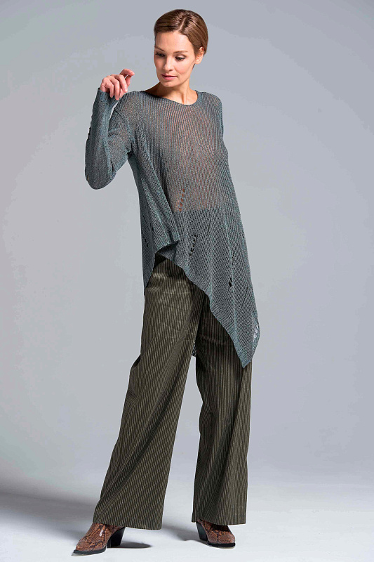 Широкие льняные брюки-палаццо, карманы с отрезным бочком, пояс на резинке и на пуговице. С помощью брюк-палаццо можно создать абсолютно любой образ от сдержанно-делового до роскошного вечернего и расслабленного бохо. Модель выполнена из прекрасного итальянского льна с небольшим добавлением эластана. Полоска визуально вытягивает силуэт и придает модели шарм и динамику.