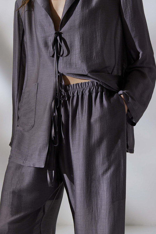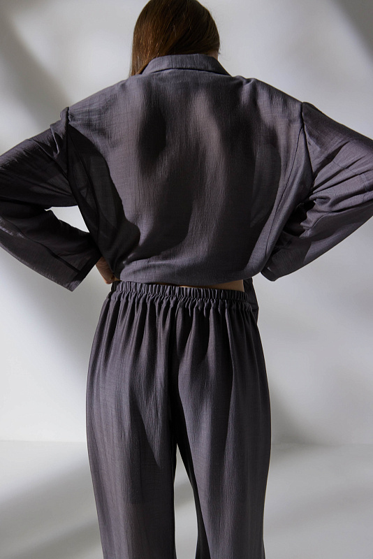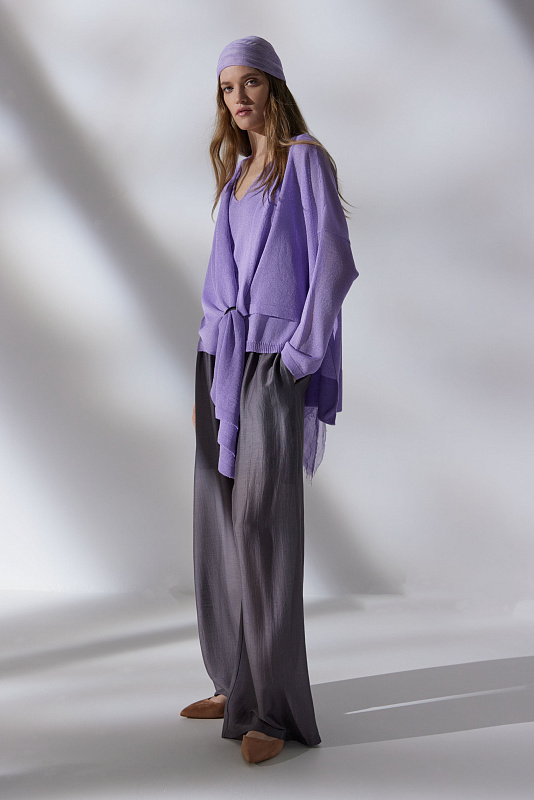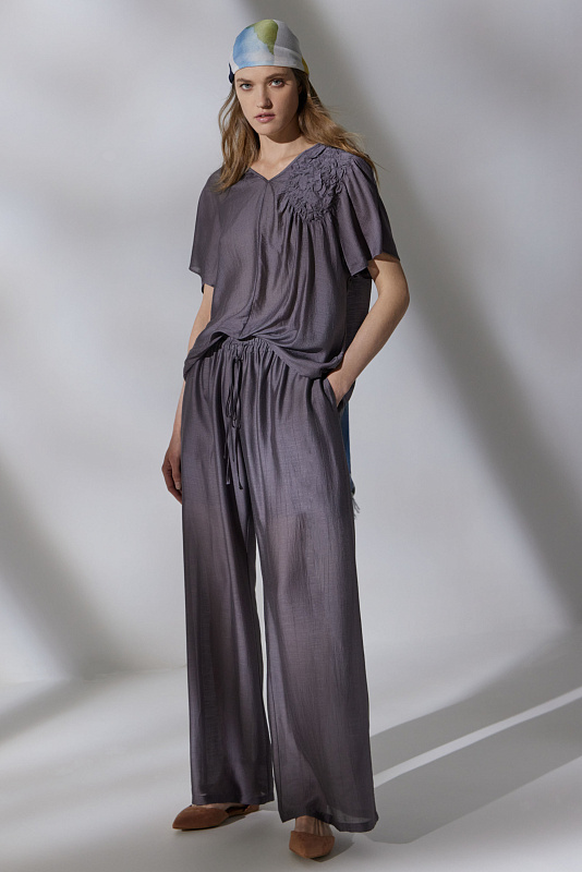 Легкие широкие брюки выполнены из микромодала с добалвением шелка. Пояс на резинке и на декоративном шнурке. Карманы в боковых швах. Внутренние шортики из такой же ткани добавляют комфорта. Стилизуем брюки с жакетом или блузой из одноименной капсулы.