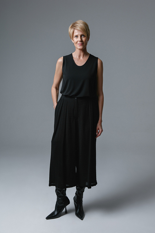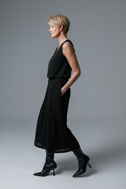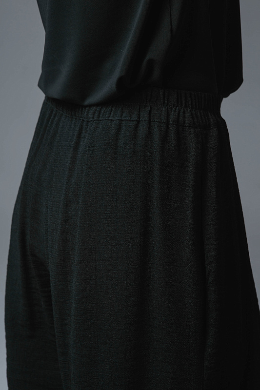Широкие укороченные брюки из крепа. Сзади пояс на резинке. Застежка на молнию и пуговицу. Вертикальные складки добавляют брюкам динамичности при ходьбе. Будут гармонично смотреться как с базовыми топами, так и в сочетании с более праздничными вариантами.