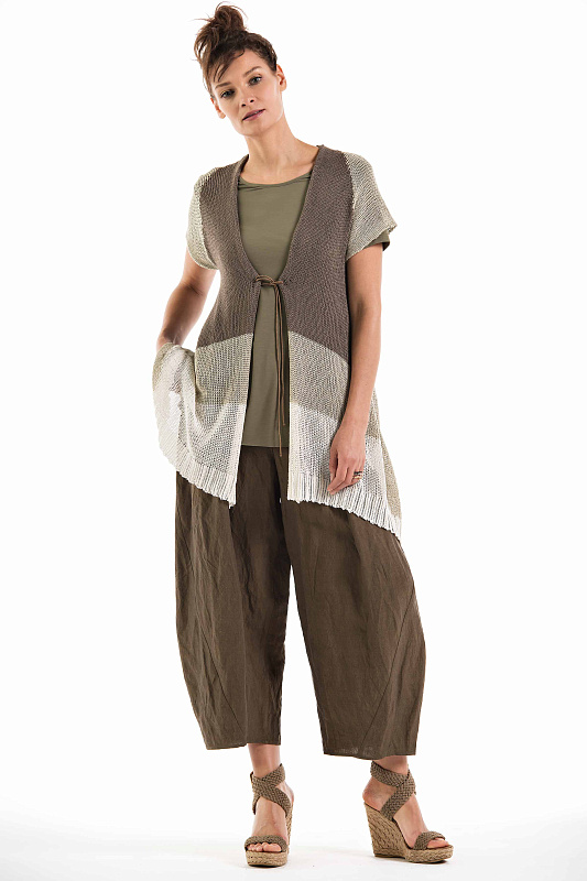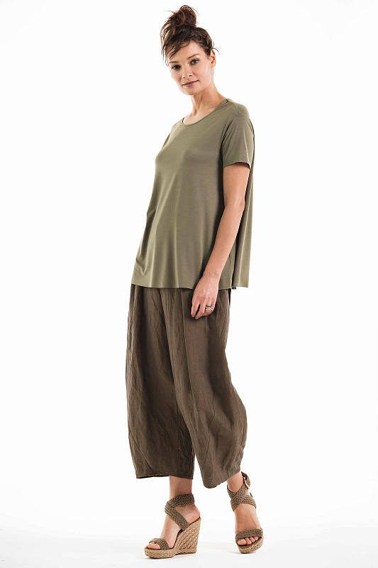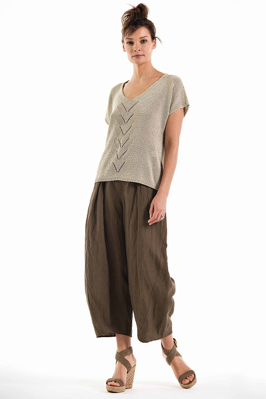 Брюки широкие, укороченные, пояс на резинке, карманы с отрезным бочком. Брюки оригинальной овальной конструкции, со смещенными швами и глубокими, встречными, вертикально ниспадающими складками. Благодаря оригинальной конструкции, брюки прекрасно сидят по фигуре. Длина изделия по боковому шву около 94 см.