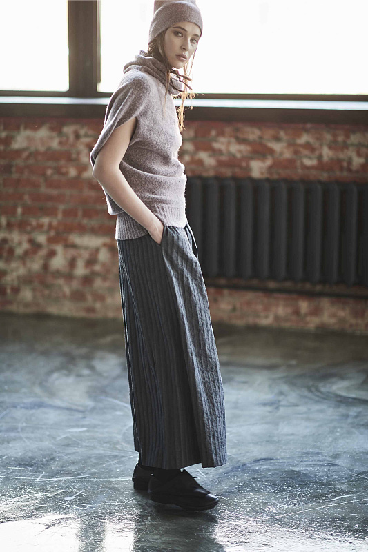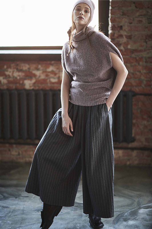 Широкие укороченные брюки кюлоты с поясом на резинке с легкой оборкой выше талии и вертикальными складками на передних полотнищах и карманами в шве из тонкой шерсти с хлопком.