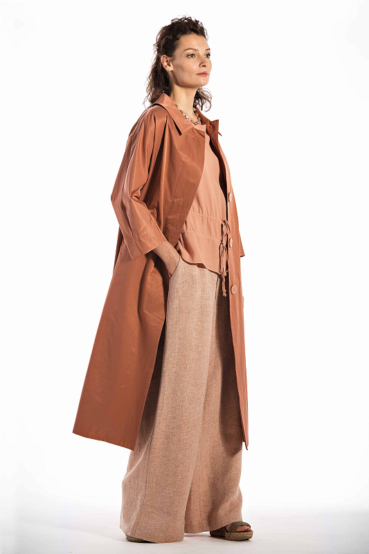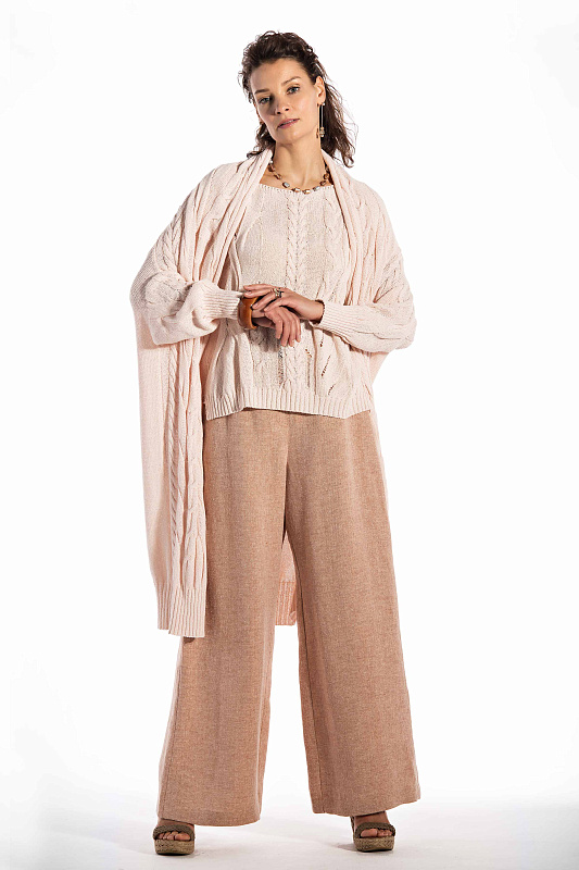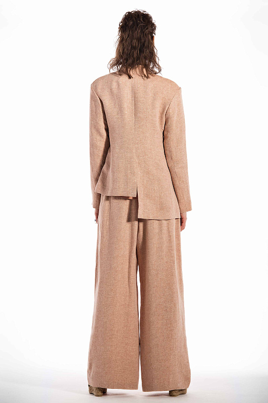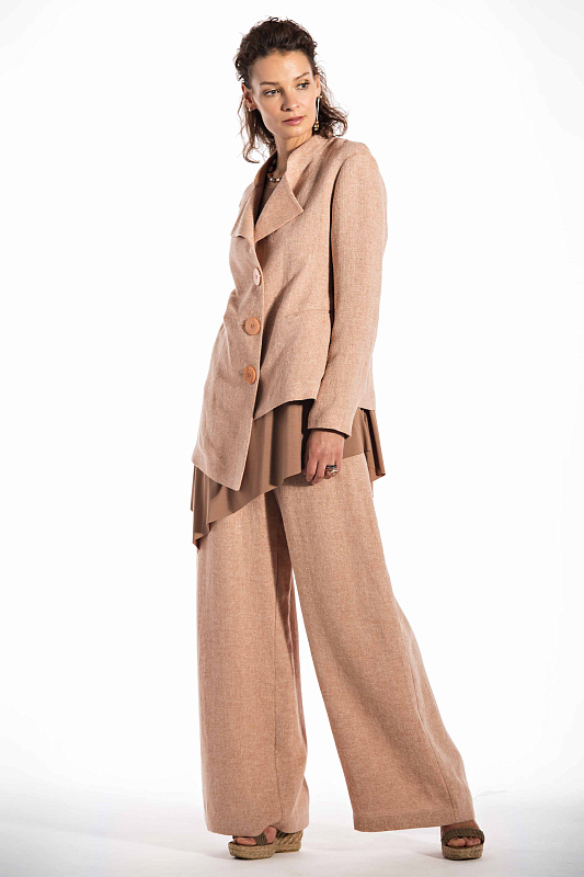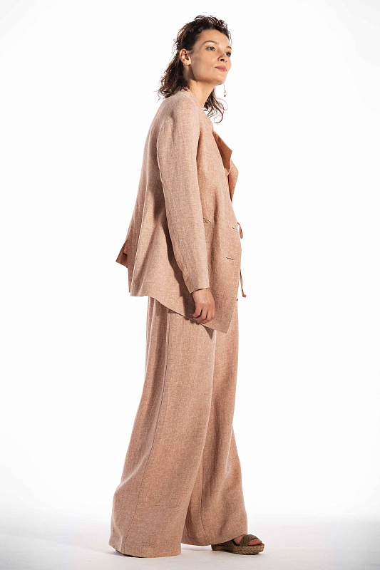Широкие брюки с высокой линией талии, с застежкой на молнию и пуговицу, пояс на резинке, карманы с  отрезным бочком. Ткань твидового переплетения с рисунком "в елочку". Состав ткани оригинален - шелк-сырец и лен. Длина изделия по боковому шву  103 см.