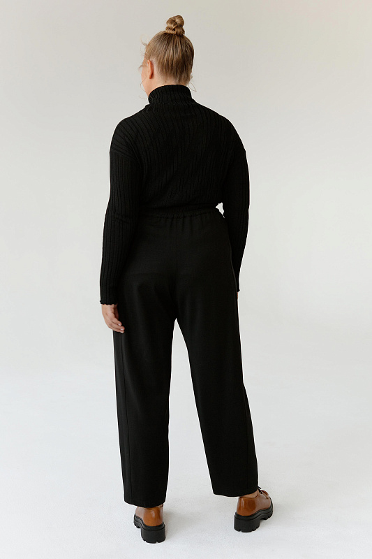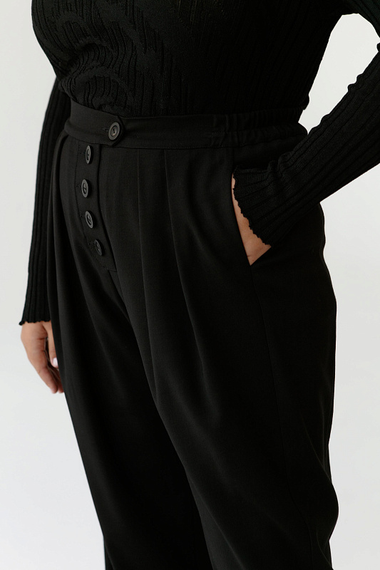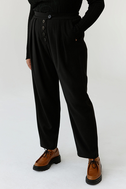 Брюки бананы со встречными ниспадающими складками из шерстяной ткани. Карманы с отрезным бочком, пояс на резинке,  застежка на пуговицах.