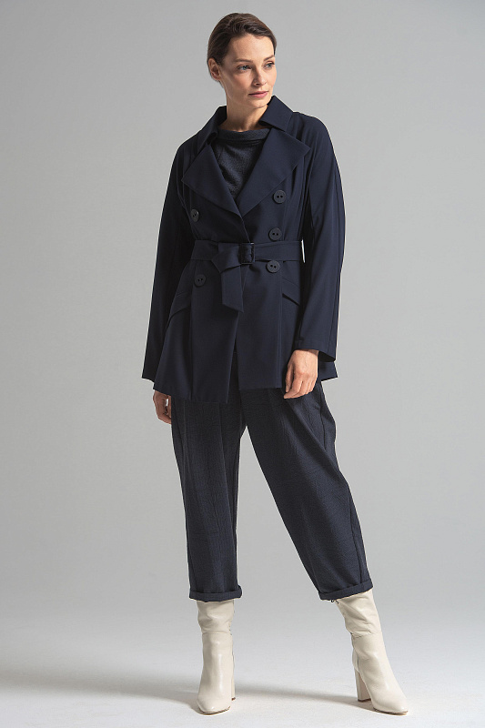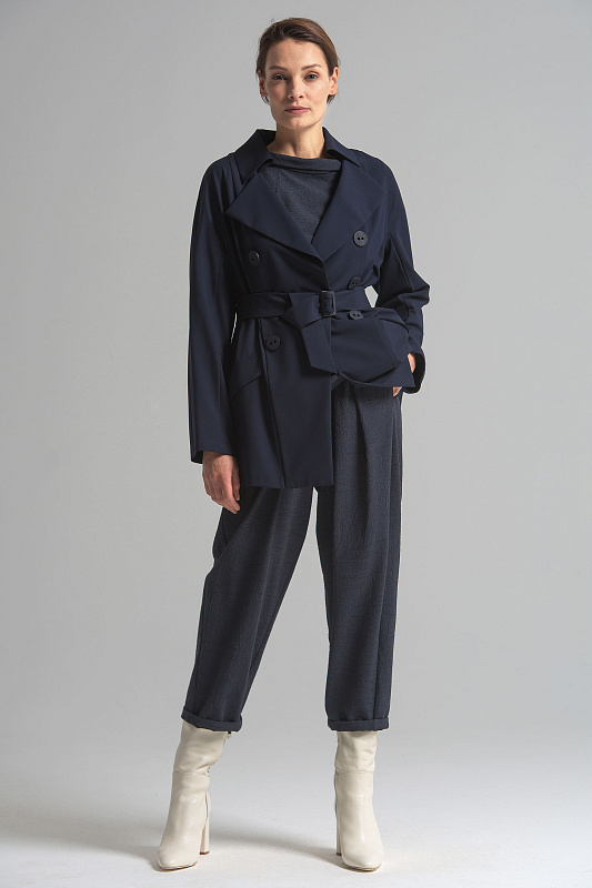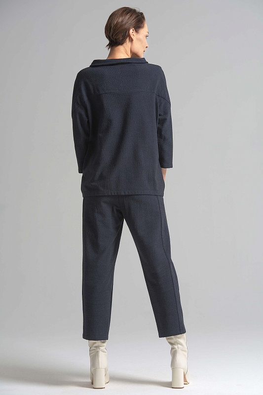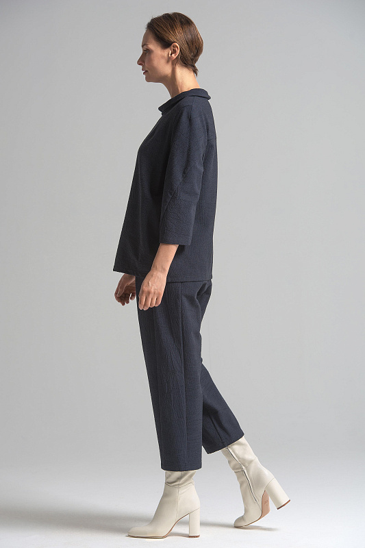 Укороченные брюки с отворотами и встречными ниспадающими складками. Карманы в шве, пояс на резинке и кулиске. Ткань – фактурная жатка из вискозы с хлопком и небольшим содержанием эластана. Жатая ткань – это долговечные складки, морщины и заломы, которые создаются на ткани под контролем итальянских производителей.