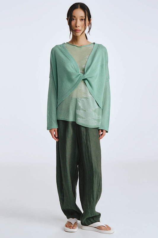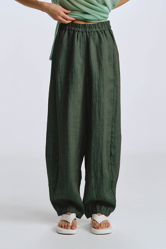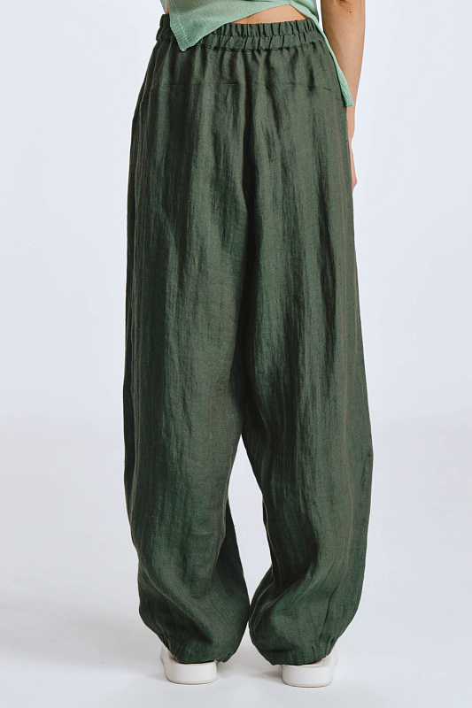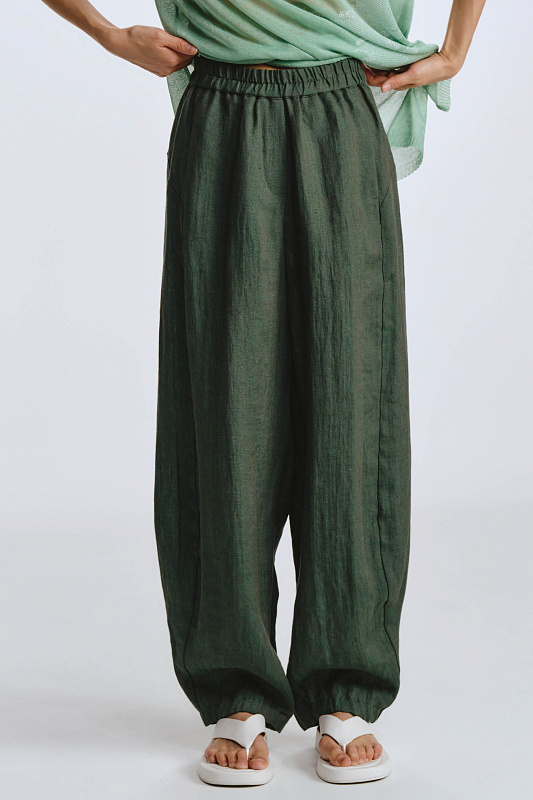 Свободный крой брюк, подчеркнутый двойной резинкой — на поясе и по низу манжетами, создает силуэт, который танцует с каждым вашим шагом. Карманы в урбанистическом ритме — крайне необходимая деталь. Брюки из льна сохраняют благородную текстуру и экологичную чистоту. С каждой стиркой лен становится мягче. Эта модель идеальна для тех, кто знает, что мода — это свобода, а не правила.