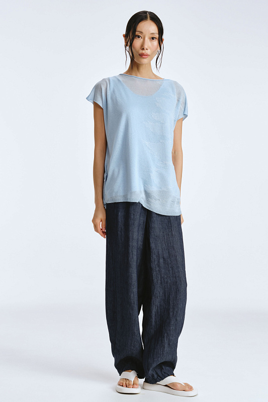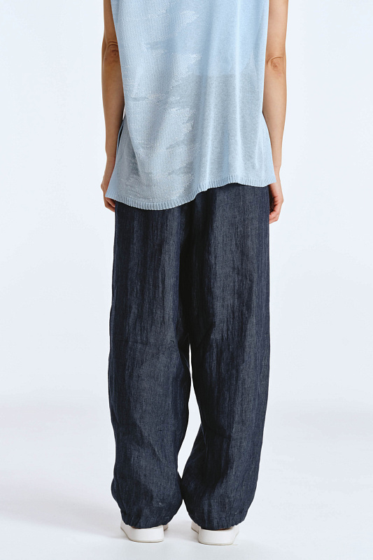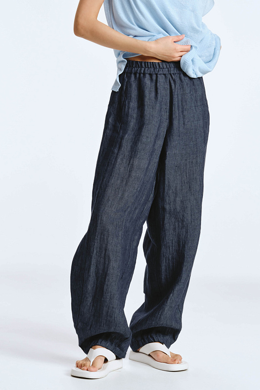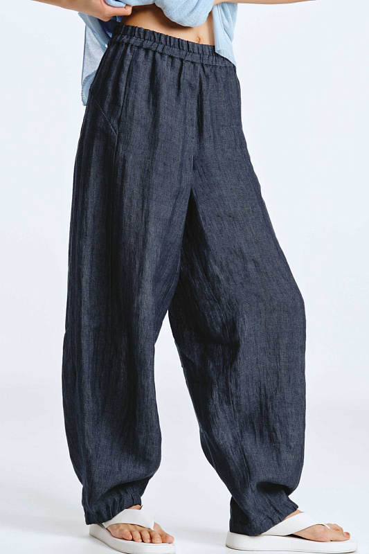 Свободный крой брюк, подчеркнутый двойной резинкой — на поясе и по низу манжетами, создает силуэт, который танцует с каждым вашим шагом. Карманы в урбанистическом ритме — крайне необходимая деталь. Брюки из льна сохраняют благородную текстуру и экологичную чистоту. С каждой стиркой лен становится мягче. Эта модель идеальна для тех, кто знает, что мода — это свобода, а не правила.