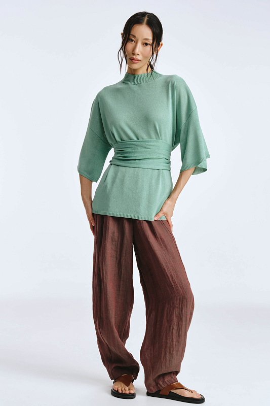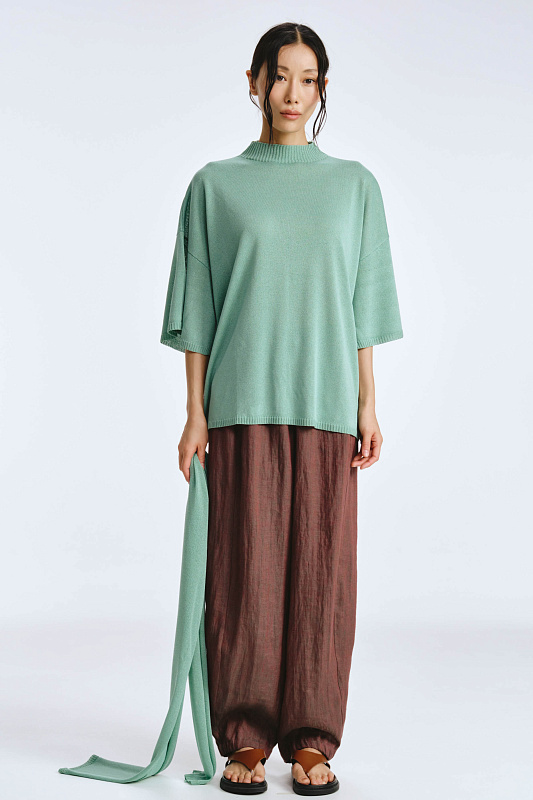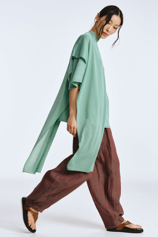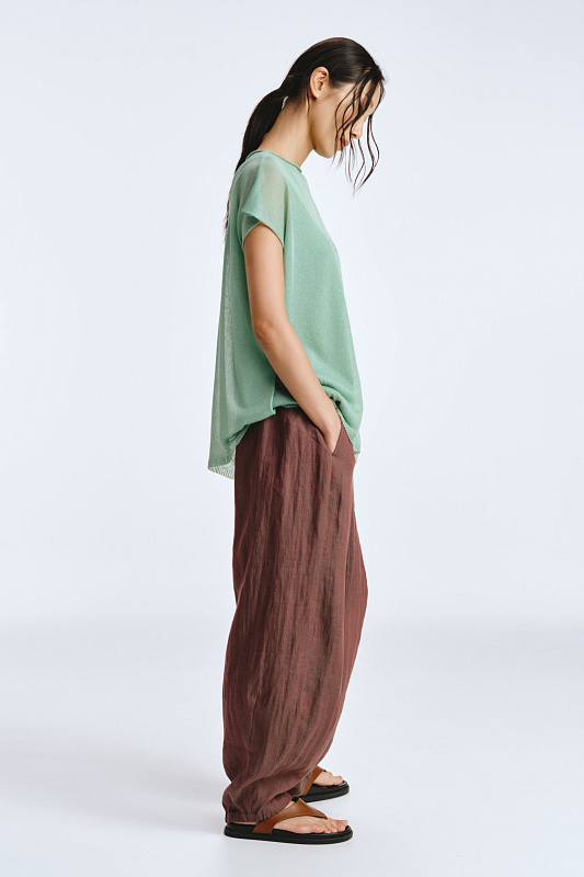 Свободный крой брюк, подчеркнутый двойной резинкой — на поясе и по низу манжетами, создает силуэт, который танцует с каждым вашим шагом. Карманы в урбанистическом ритме — крайне необходимая деталь. Брюки из льна сохраняют благородную текстуру и экологичную чистоту. С каждой стиркой лен становится мягче. Эта модель идеальна для тех, кто знает, что мода — это свобода, а не правила.