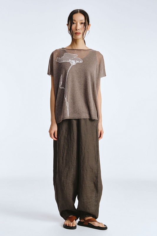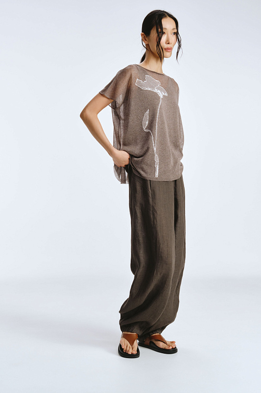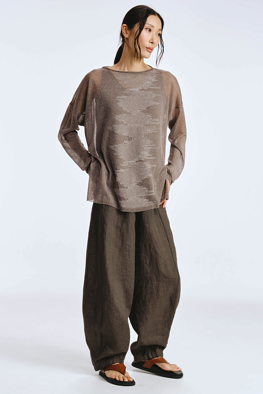 Свободный крой брюк, подчеркнутый двойной резинкой — на поясе и по низу манжетами, создает силуэт, который танцует с каждым вашим шагом. Карманы в урбанистическом ритме — крайне необходимая деталь. Брюки из льна сохраняют благородную текстуру и экологичную чистоту. С каждой стиркой лен становится мягче. Эта модель идеальна для тех, кто знает, что мода — это свобода, а не правила.