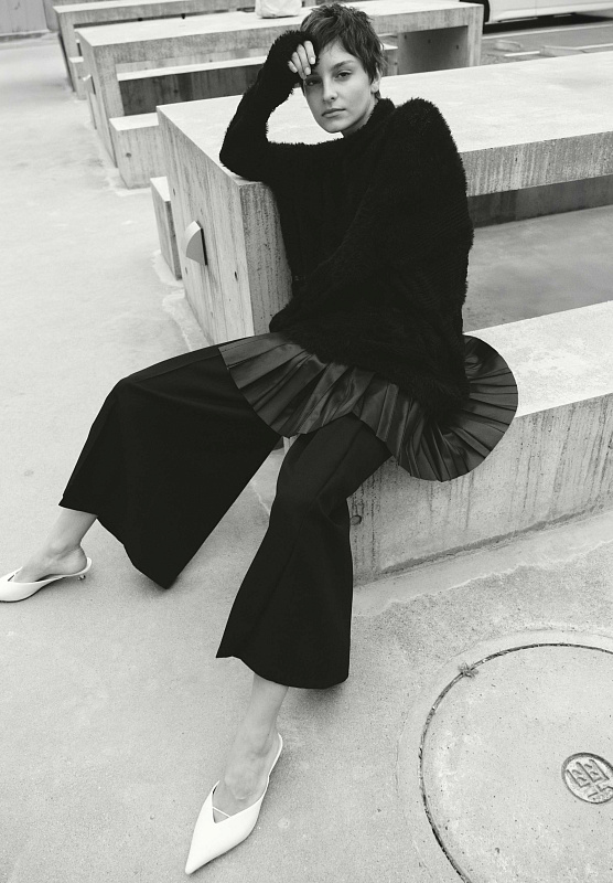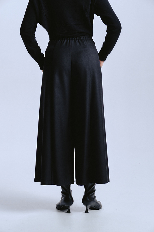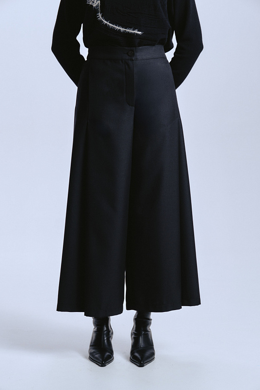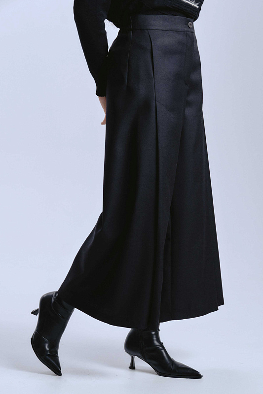 Брюки укороченные со складкой в современном динамичном стиле городского шика. Длина брюк — один из самых популярных и универсальных вариантов укороченных брюк. Она идеально балансирует между элегантностью и легкостью. Силуэт: облегающий верх, плавно переходящий в широкий и свободный клеш к низу. Уникальная, глубокая фронтальная складка является конструктивным продолжением кармана. Карманы расположены в начале складки, которая застрочена длиннее обычной и расходится к низу, формируя ширину. Застежка комфортная для посадки и регулировки — молния и пуговица спереди, эластичная резинка на задней части пояса. Центральный задний шов — отличительная черта модели, создающая необычный силуэт. Наслаждайтесь ощущением натуральной шерсти: ткань дышит, обеспечивает комфорт в любую погоду и обладает благородным внешним видом. Полиэстер в составе гарантирует, что брюки сохраняют безупречную форму в течение дня.