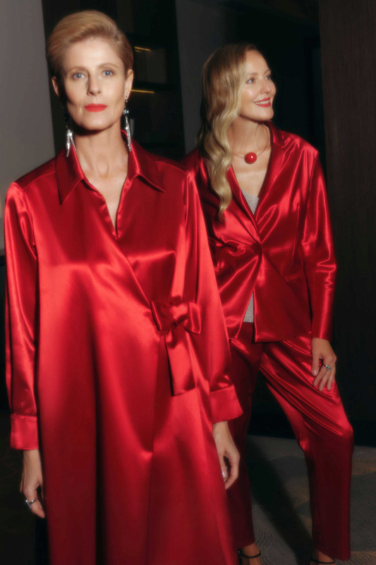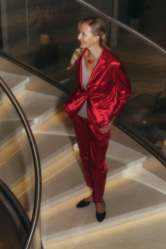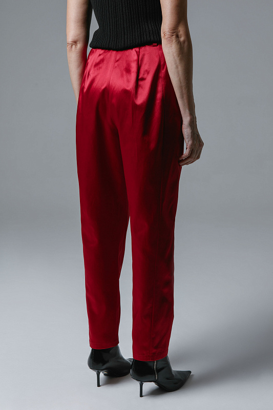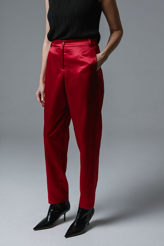 Брюки из премиального атласа с добавлением шелка без подкладки силуэта бананы. Исполнены в трендовом оттенке кармин. Удобный пояс на резинке сзади, застежка на пуговицу и молнию. Станут главным акцентом в праздничном образе и хорошо впишутся в повседневный гардероб в качестве яркой детали. Вместительные карманы в боковых швах. Рекомендуем носить вместе с жакетом из одноименной капсулы для создания стильной костюмной пары.