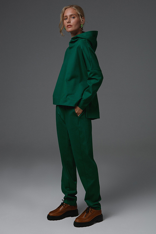 Трендовые узкие брюки силуэта бананы из плотного эластичного джерси. Брюки на резинке с имитацией гульфика. Карманы с отрезным бочком.