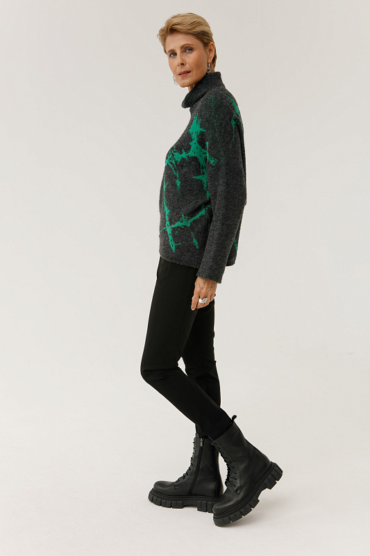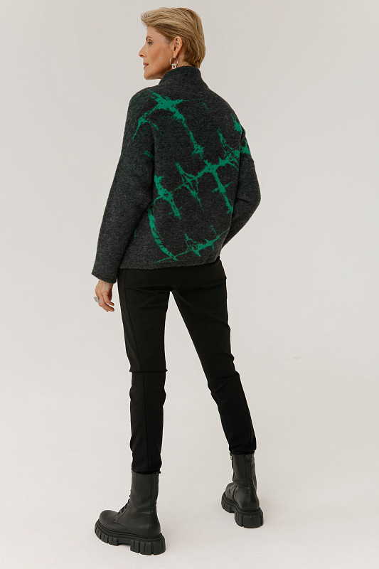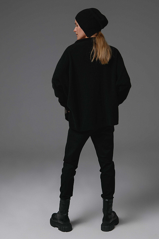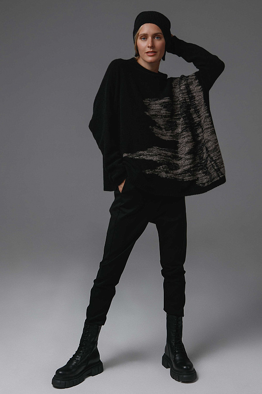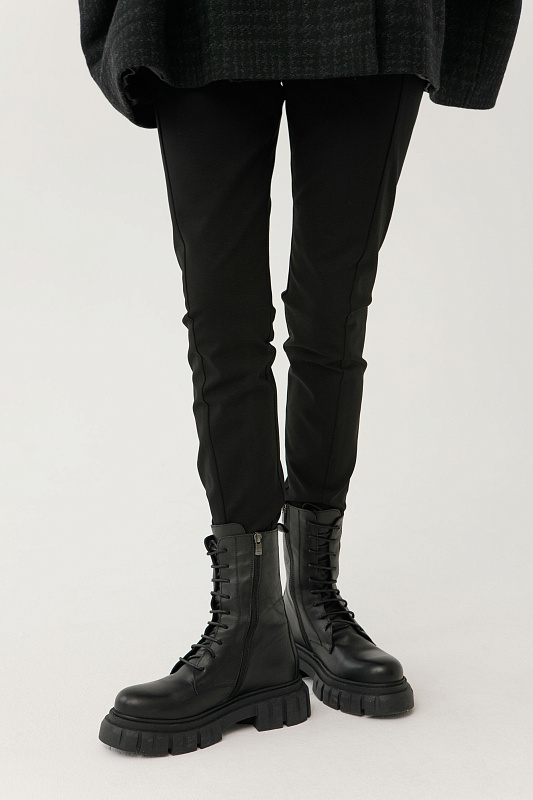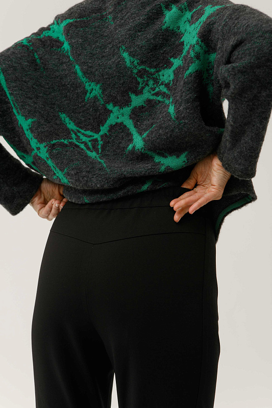 Узкие прямые брюки с лампасами из плотного джерси с эластаном. Пояс сзади на резинке. Брюки застегиваются на молнию и пуговичку. Два удобных кармана.