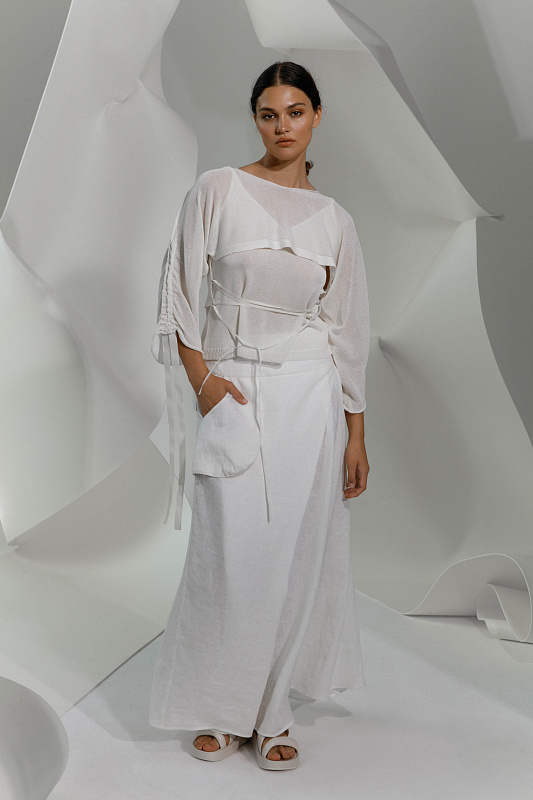 Легкое укороченное болеро с коротким рукавом с драпировкой и эффектными завязками из декоративных лент разной толщины. С декоративными кольцами на талии. Полупрозрачное струящееся полотно. Модель выполнена из тонкой и нежной Итальянской вискозы с мерцающим блеском.