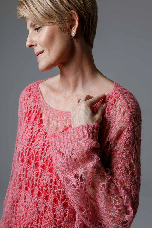 Легкий вязаный джемпер - паутинка расслабленного прямого силуэта, полупрозрачной текстуры с ажурным узором. С длинным рукавом и горловиной – лодочка, которая позволяет стилизовать изделие поверх рубашки или водолазки. Выполнен из итальянской пряжи меланжированного мягкого мохера.