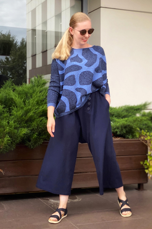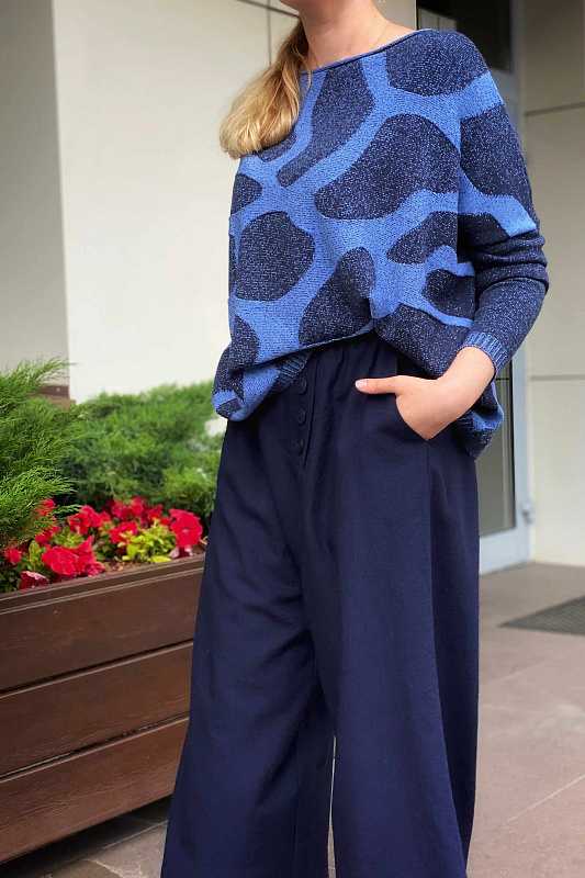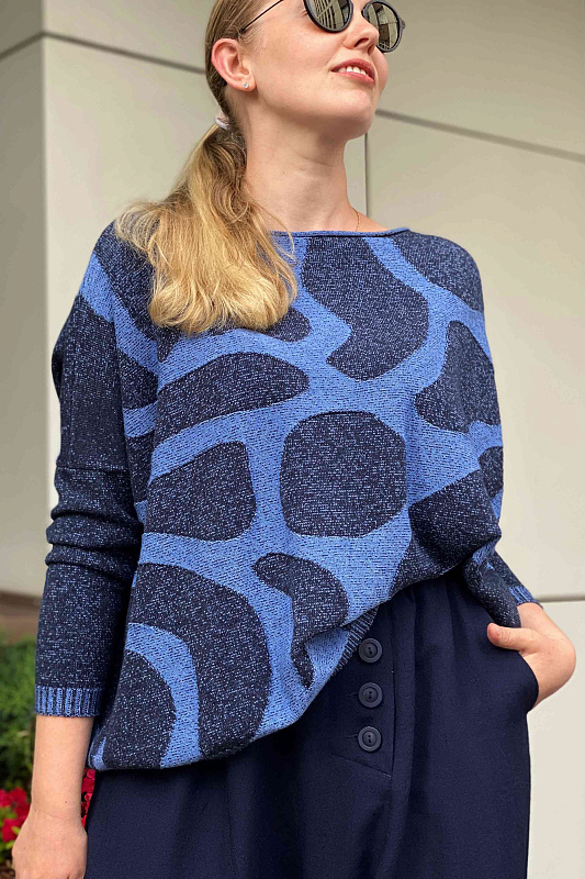 Оригинальный джемпер прямого силуэта из нежной итальянской вискозы с кашемиром с вывязанным абстрактным рисунком, вырез горловины лодочка с руликом, спущенная линия плеча.