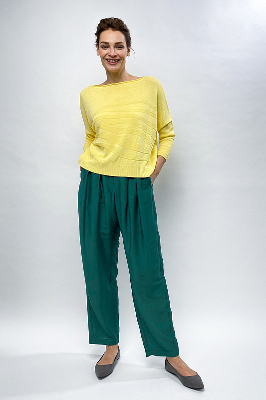 Джемпер прямого силуэта, длинный рукав, вырез горловины - лодочка. Спущенная линия плеча придает образу мягкость. Джемпер выполнен из Итальянской глянцевой струящейся вискозы со структурным рисунком.