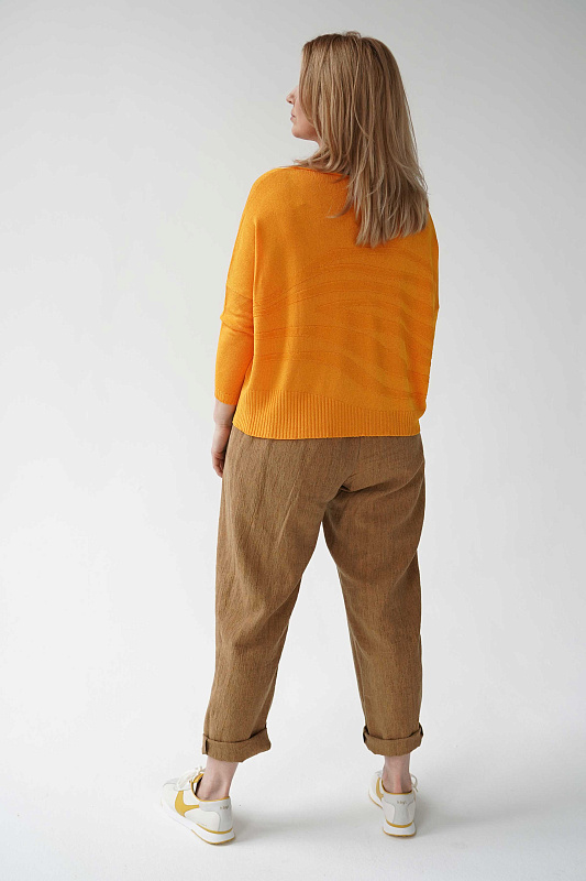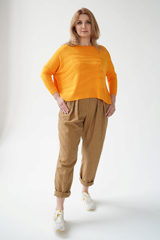 Джемпер прямого силуэта, длинный рукав, вырез горловины - лодочка. Спущенная линия плеча придает образу мягкость. Джемпер выполнен из Итальянской глянцевой струящейся вискозы со структурным рисунком.