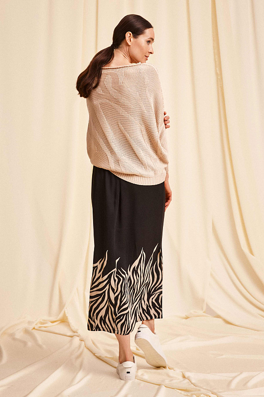 Джемпер с рельефным рисунком по полочке и спинке. Спущенная линия плеча, длинный рукав, вырез горловины лодочка с руликом. По рукавам и низу изделия — резинка. Модель выполнена из вязаной пряжи нежной итальянской вискозы.