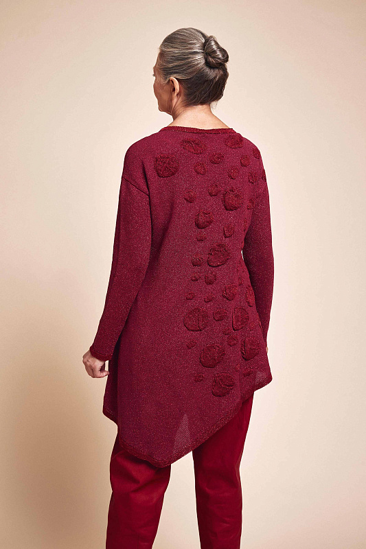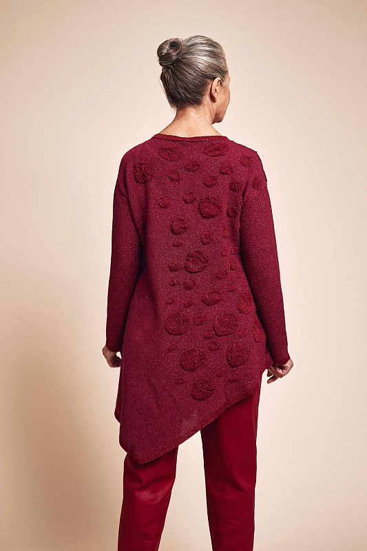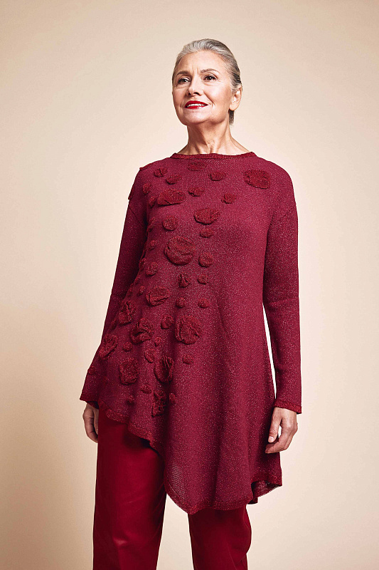 Блуза А-силуэта, спущенная линия плеча, вырез горловины лодочка с асимметричным диагональным низом, удлиненным по левой стороне лимитированной коллекции Resort 2019 из плотного мерцающего полотна с люрексом комбинированной вязки - соединение сложной объемной фактуры, влияющей на конструкцию модели, с гладкой. Благородный блеск помогает создать многогранный и элегантный образ как для повседневного, так и для вечернего выхода.