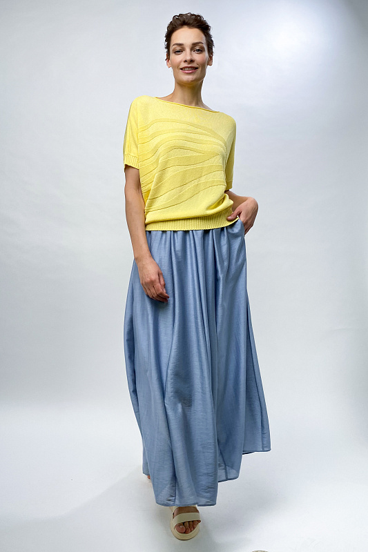 Джемпер с коротким рукавом  гофре силуэта «ромб» станет базовой вещью любого гардероба. Вырез горловины - лодочка, короткий рукав и низ изделия – резинка. Модель выполнена из итальянской глянцевой струящейся вискозы со структурным рисунком.